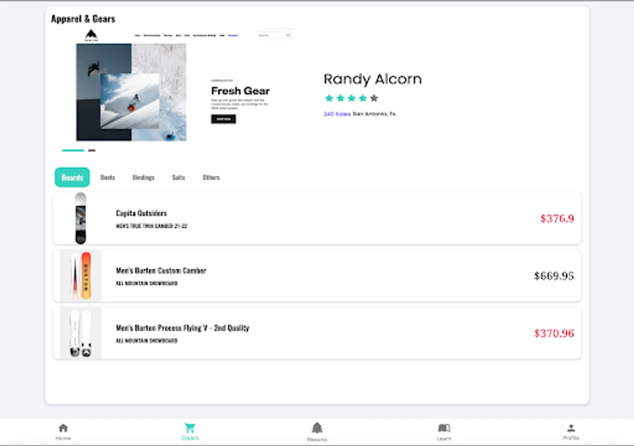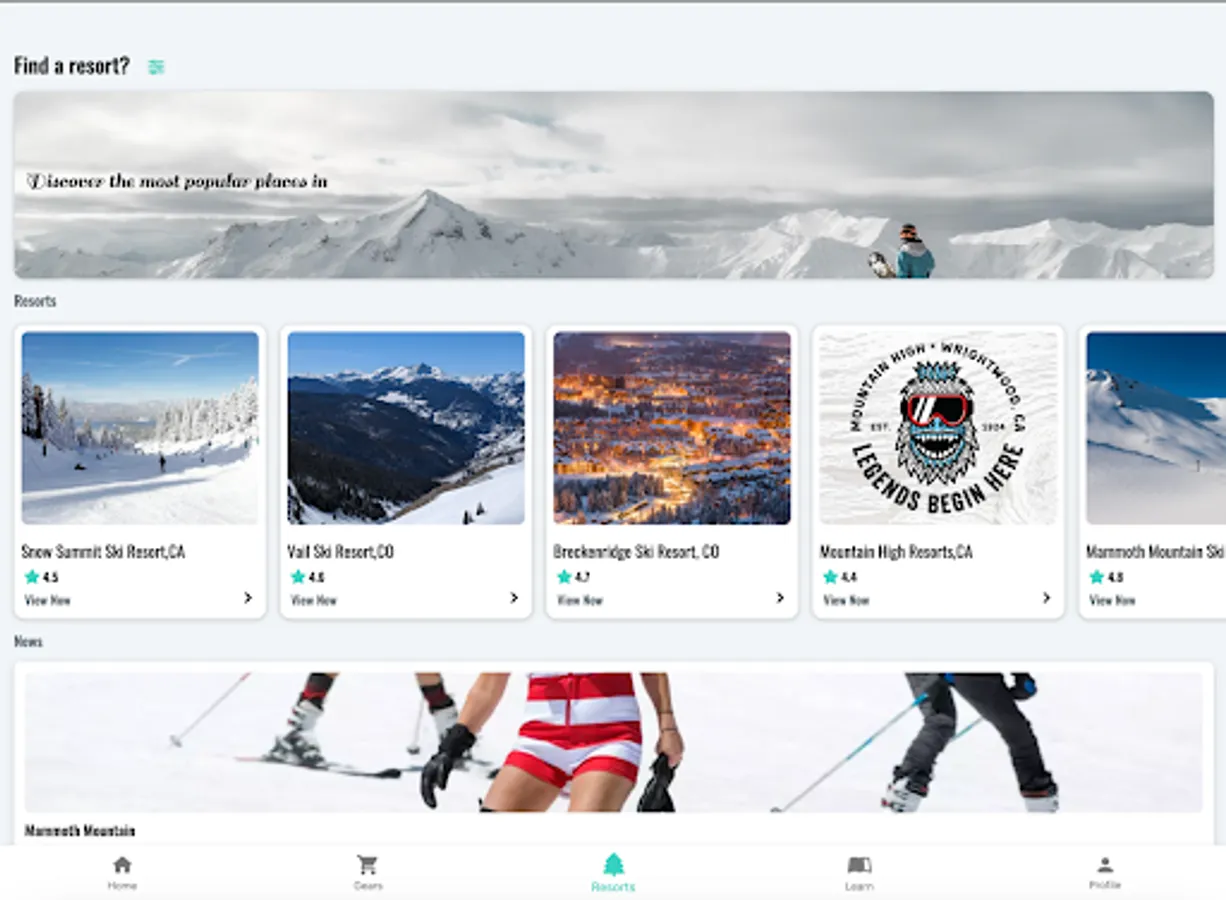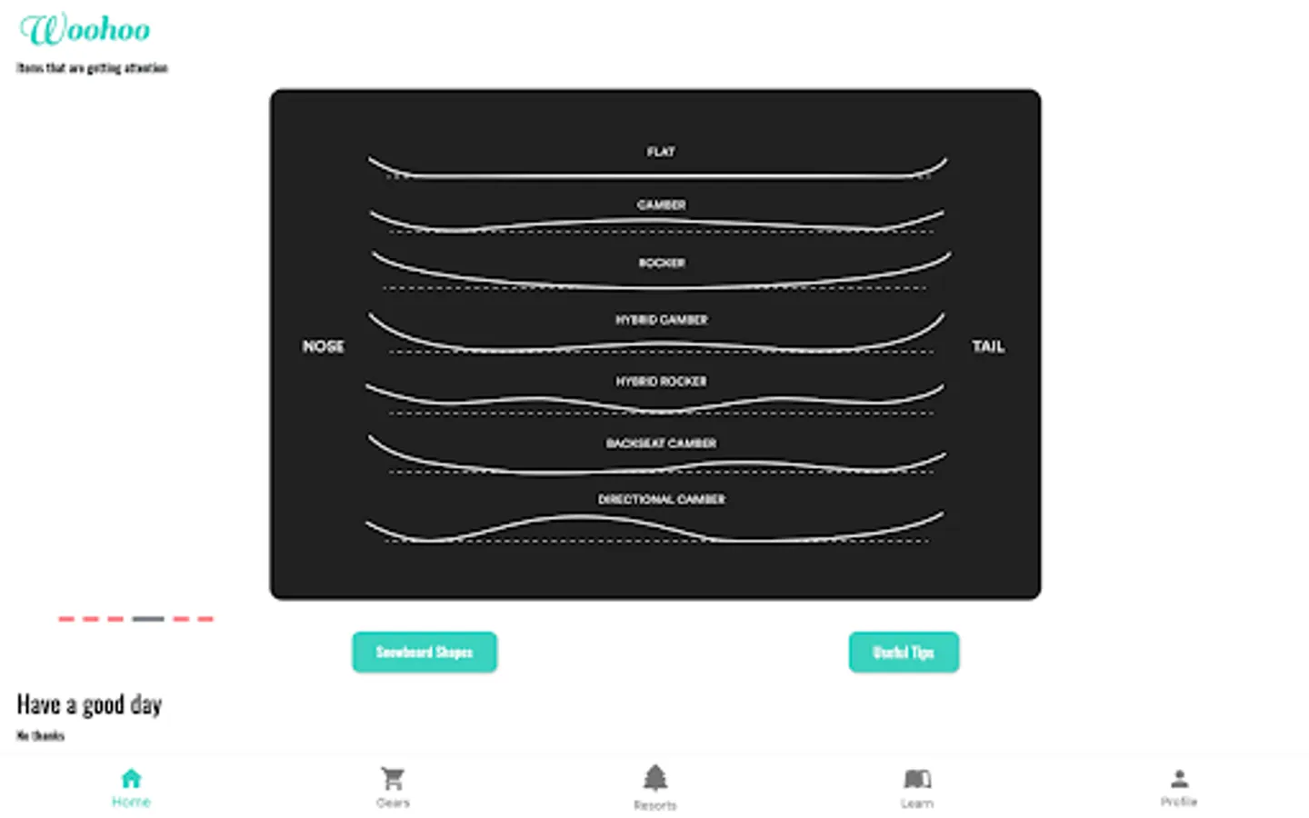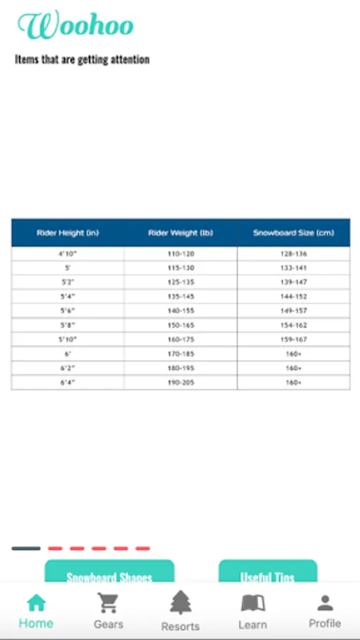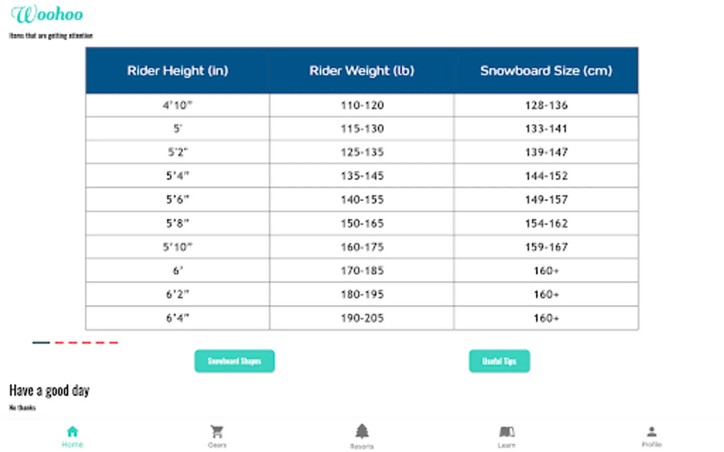 The Woohoo app contains everything you need to start snowboarding. Here, you can see the personalized snowboard dimensions, prices for all the gears you need, recommended snowboarding resorts, and snowboarding guide videos for different experience levels.