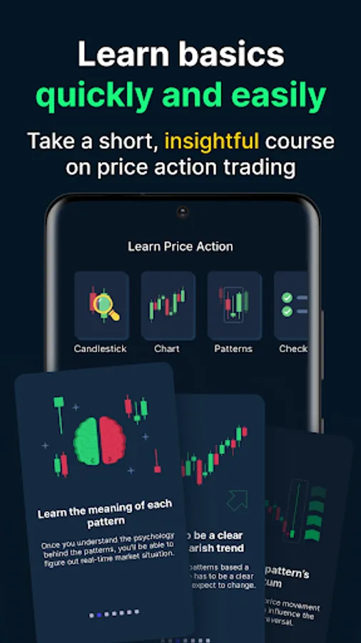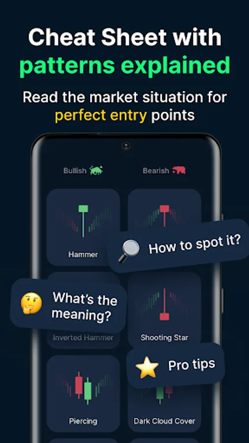 Our app also includes the most popular candlestick patterns cheat sheet, with each trading pattern explained in a clear and easy-to-understand manner. With TradingCake, identifying patterns quickly and effectively is at your fingertips.