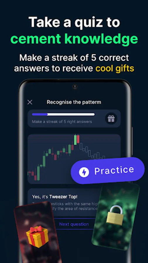 To further solidify your trading education, TradingCake presents an interactive lesson designed to help users recognize and memorize diverse candlestick chart patterns. Our insightful quiz is packed with hints and detailed explanations for every chart pattern, ensuring that recalling candlestick chart patterns becomes second nature. Regardless of your experience level, TradingCake is your go-to app for mastering candlestick patterns and chart analysis. Elevate your trading prowess and fortify your confidence with TradingCake today!
