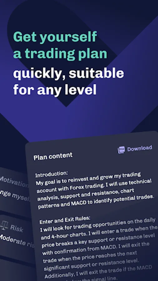 Plancana empowers traders of all levels to create a personalized trading plan that takes into account their financial goals and motivations. You'll have guidelines to a wide range of markets, including forex, crypto, stocks, commodities, and more, so you can choose the one that best suits your trading style. It also takes into account your preferred trading style. Whether you're a scalper, day trader, swing trader, or position trader, Plancana has got you covered. But that's not all – Plancana uses AI technology to help you create clear and precise entry and exit rules based on your preferred analysis tools, whether it's technical or fundamental analysis, chart patterns, or trend analysis. You'll know exactly when to open and close a trade based on your selected tools, ensuring you're always making informed decisions. Plancana also provides clear risk management rules to minimize the risk of capital loss. Based on your initial deposit, Plancana calculates your lot size and maximum drawdown, ensuring you're always trading within your means and minimizing the risk of losing your investment.