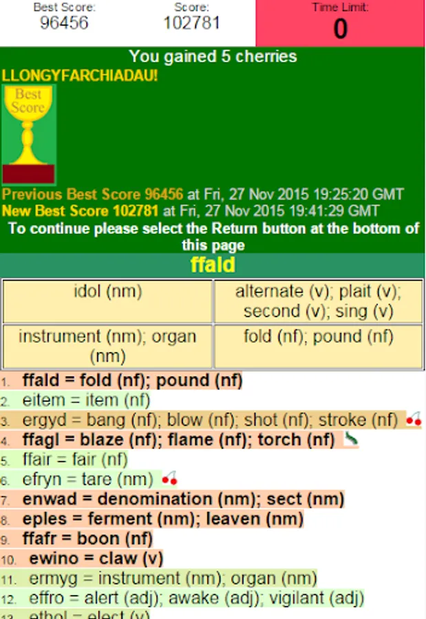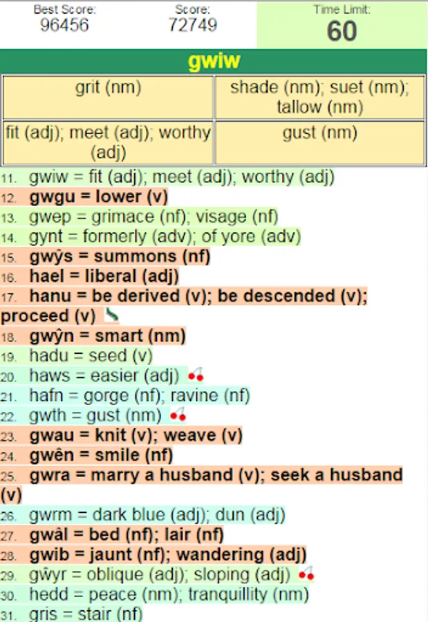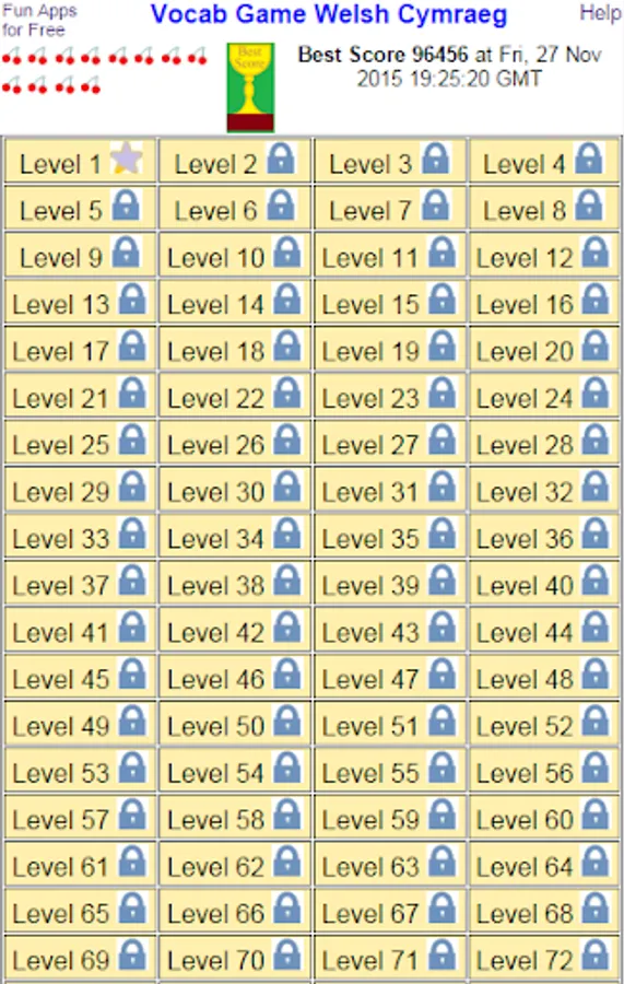 * How to Play: Select any level with a star to begin play. The game screen will appear. There are 40 words per game. You have a limited amount of time to select the correct meaning of the word. If you are playing on the highest unlocked level, the next level will be unlocked if you complete the game with enough cherries to redeem your number of incorrect answers.