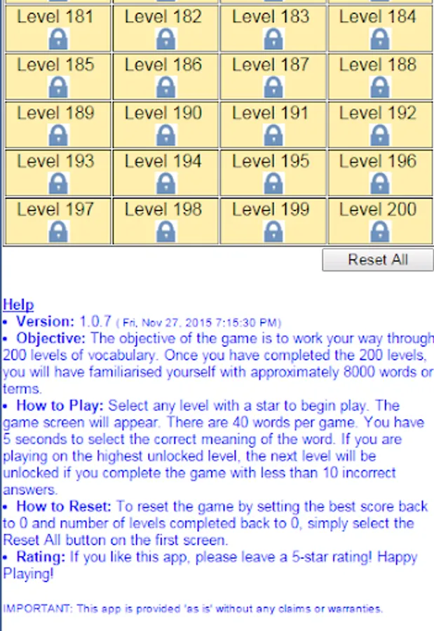 * Description: The objective of the game is to work your way through 204 levels of vocabulary. Once you have completed the 204 levels, you will have familiarised yourself with approximately 8160 words or terms. Once you have completed a level without any wrong answer, an animal may appear for that level.