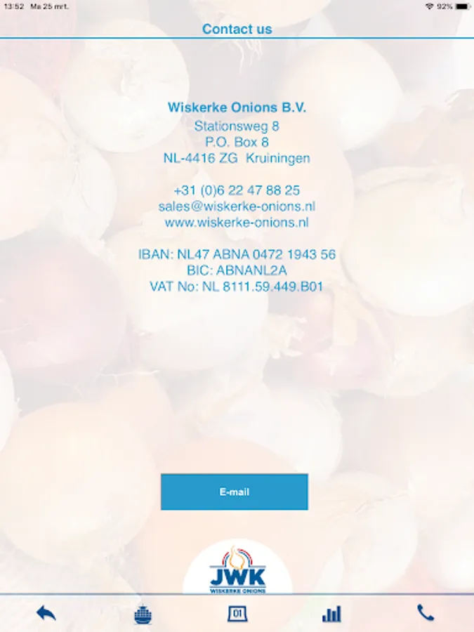 With the emphasis on the highest quality onions, Wiskerke Onions continuously monitors the product, from producer until the supermarket shelves. The country of origin and the crop registration of any batch of onions can be easily traced. Our clients have the information available at a touch of the button on our app. Aiming for quality onions, through processes of the highest standards, ánd improving upon them is the general touchstone of our team.