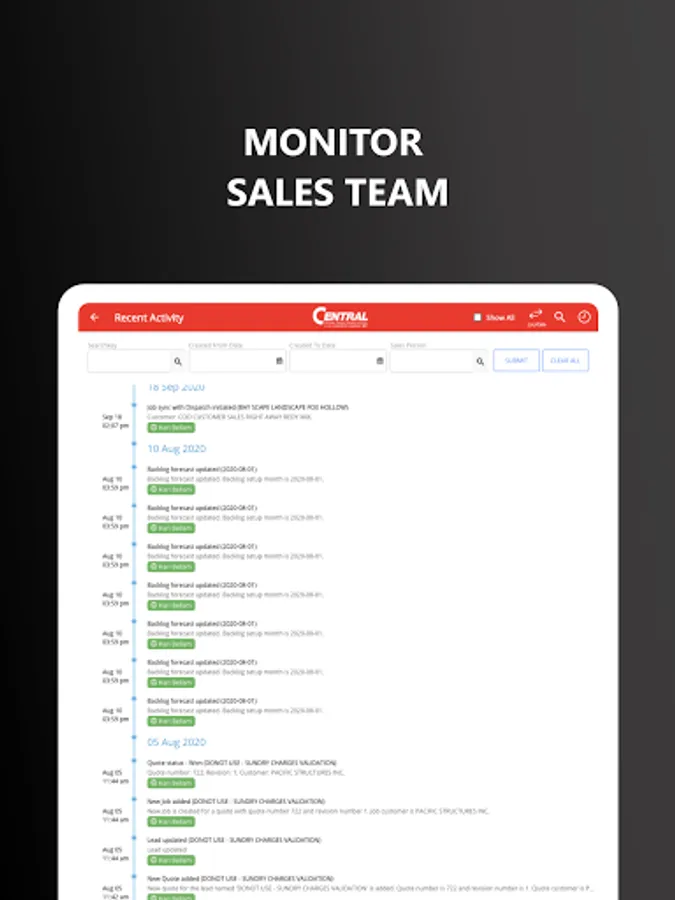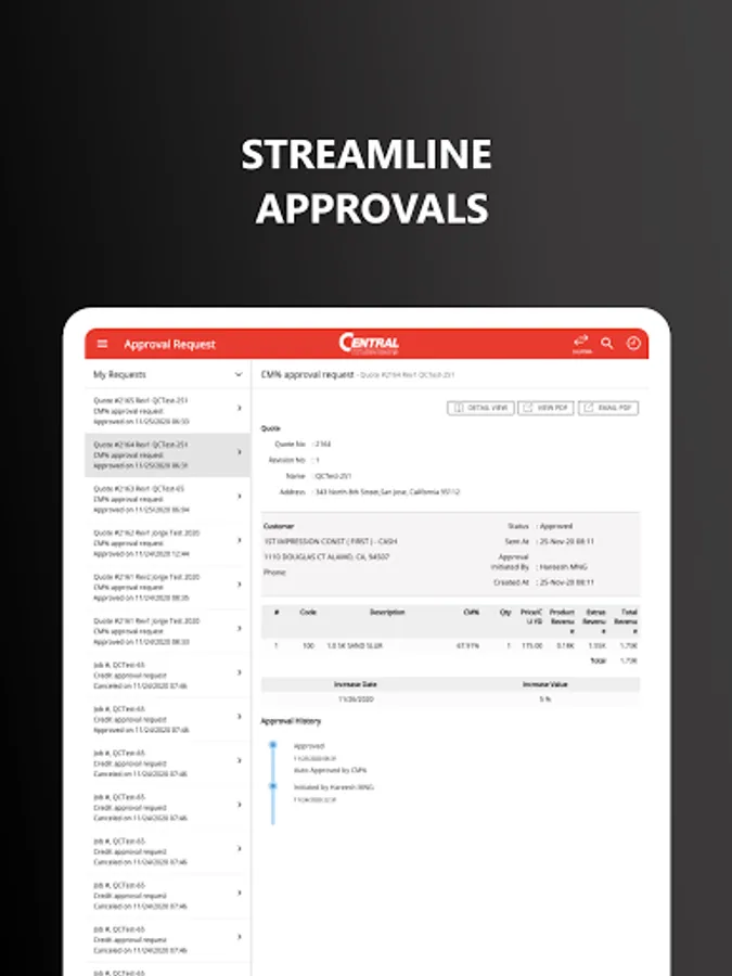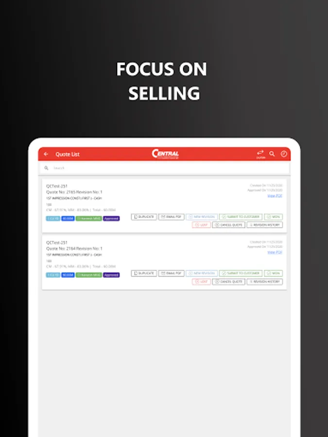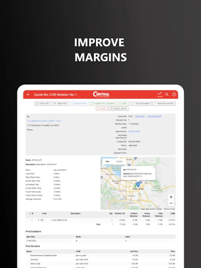 ProQuo empowers your sales team with an app to create quotes quickly. Quotes are automatically routed internally for approvals based on the rules you set and once approved are electronically sent to your customers. ProQuo is able to sync jobs directly to your dispatching system. Our advanced analytics provides your sales team with insights to quote more effectively and drive higher profit margins.