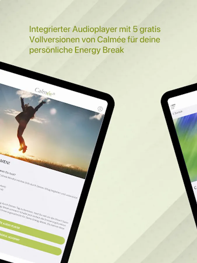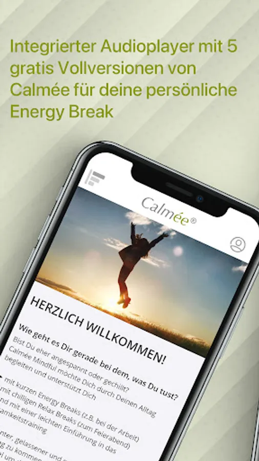 You have a lot on your mind, a tight schedule and stress is your daily companion? Then the Calmée Energy Break is the perfect stress reliever for you. With a memo function, our app reminds you how important it is to take a short break to relax and recharge your batteries. The audio player with the chilled sounds from Calmée bring you mentally and physically back from stress mode to energy flow in just a few minutes. Calmée uses a sound technology that was scientifically developed with the Technical University and has already received several awards. For everyone who wants to organize their everyday work in a more relaxed way, the app also offers a short introduction to the topic of mindfulness (mindfulness training). Calmée is an ideal companion, especially for people in the home office. The app supports organizations and companies in achieving the UN sustainability goals 3 (health & well-being) and 8 (decent work) as a "healthy workplace".