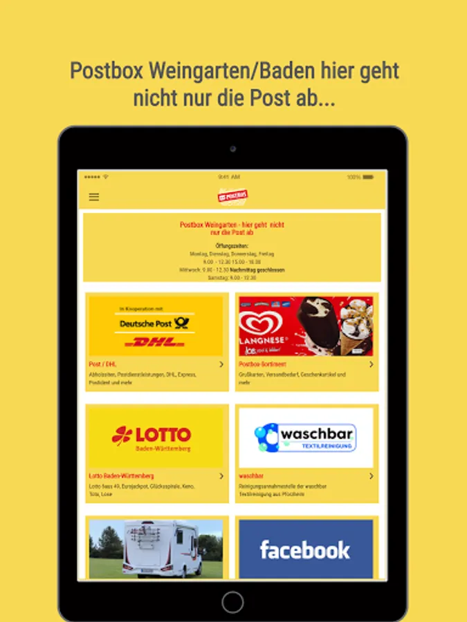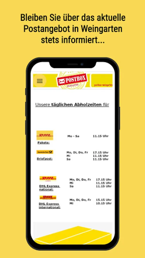 This app informs you about opening times and pick-up times of the post office in 76356 Weingarten, as well as about the entire offer of the Postbox Weingarten