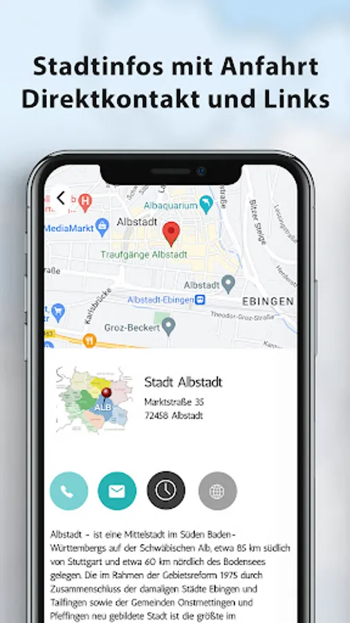 Via contact and directions, the visitor can call the town hall directly with his mobile phone or send an e-mail. The user can find their desired destination quickly and easily via Directions with navigation.
