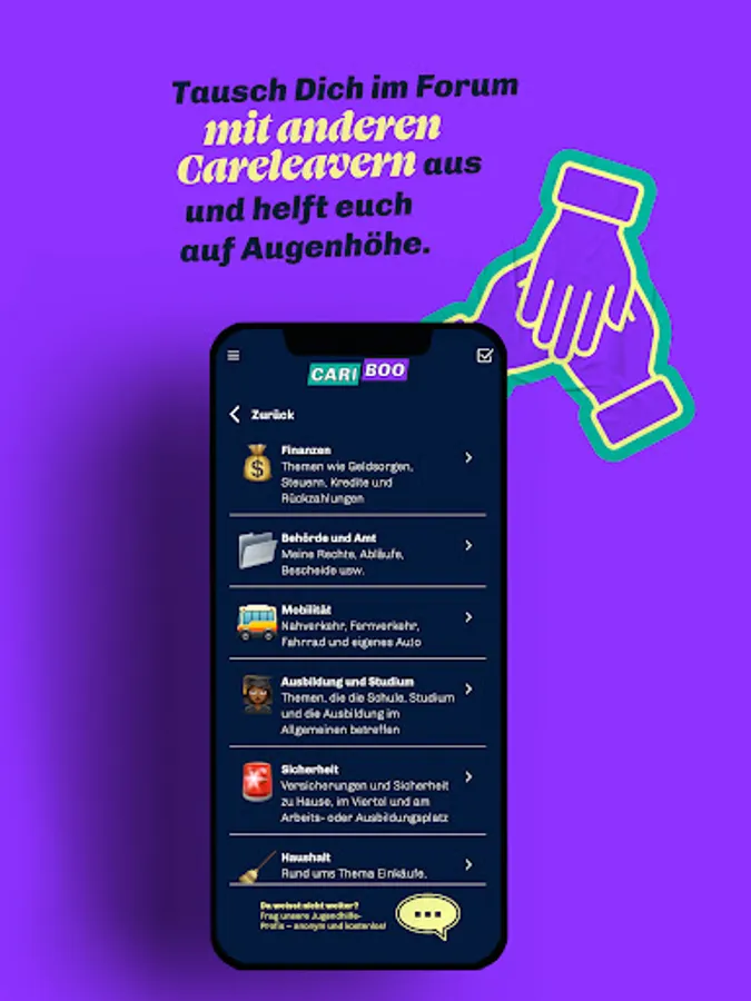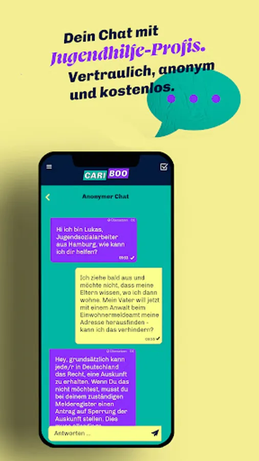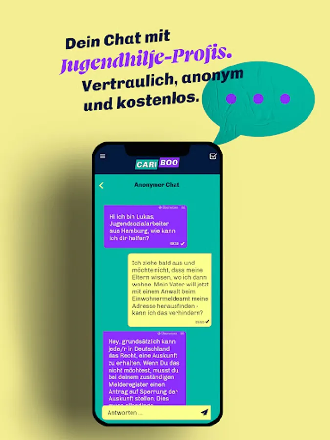 Cariboo offers support for young people with problems in youth welfare, such as problems with authorities or in relationships. It's free and anonymous, members don't learn anything about your identity. There is a moderated forum, anonymous chat with experts and helpful checklists on various topics.