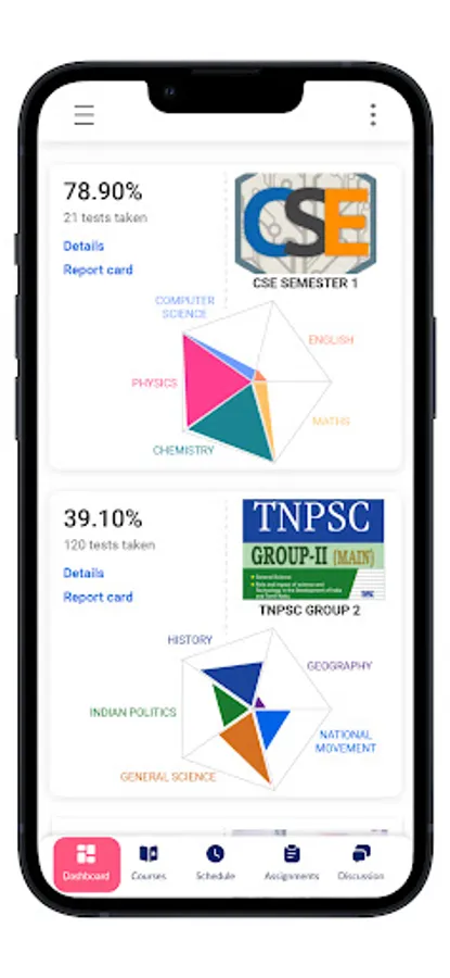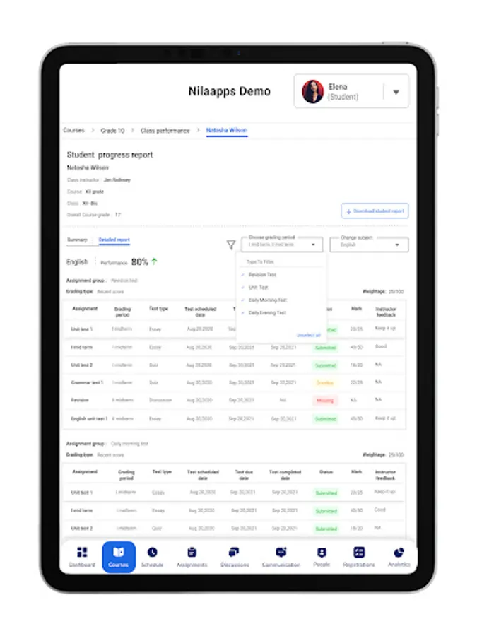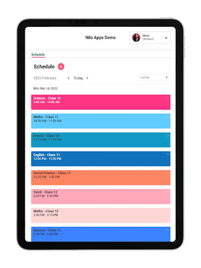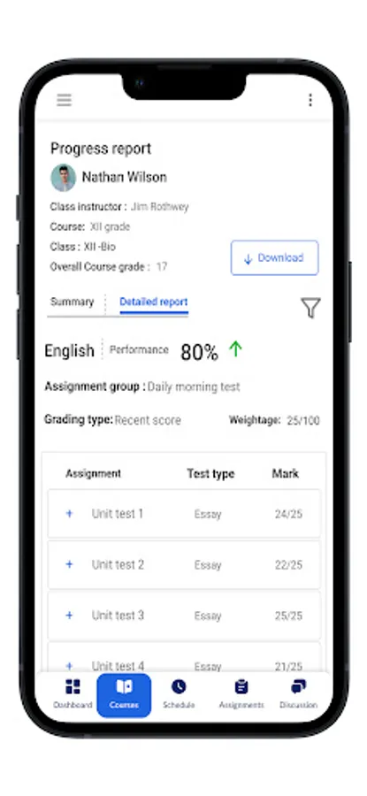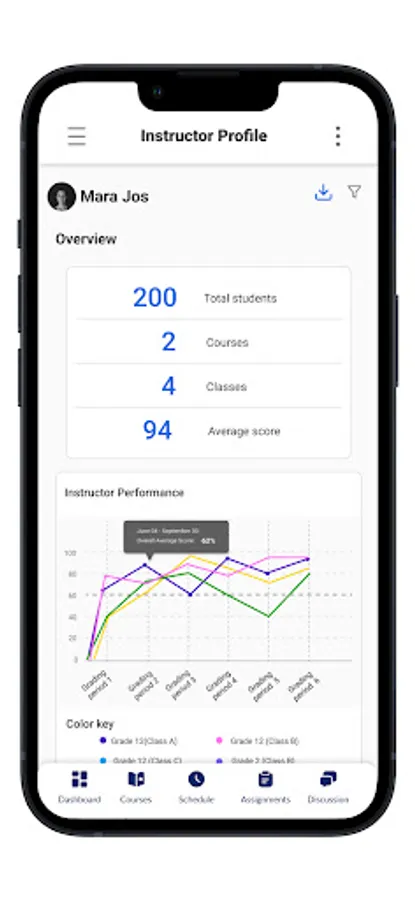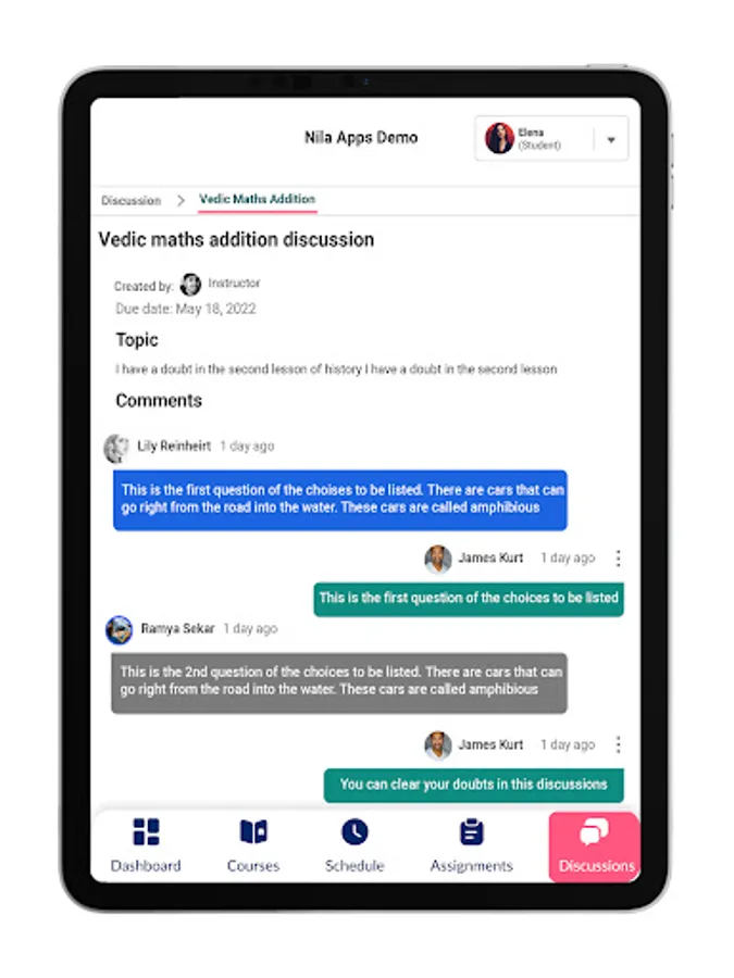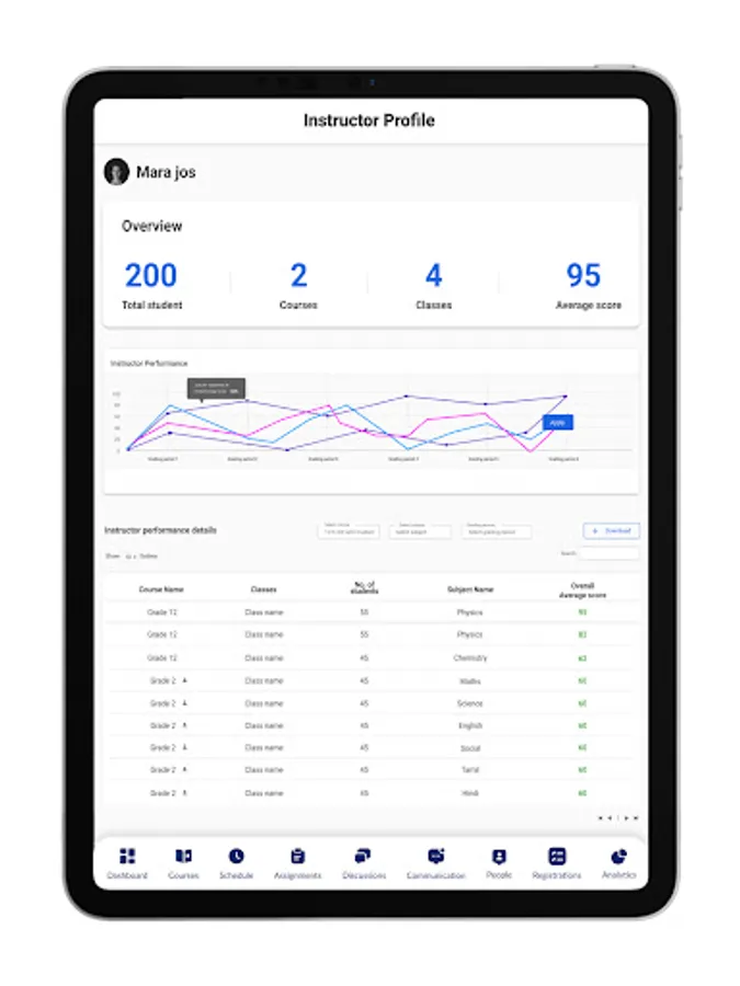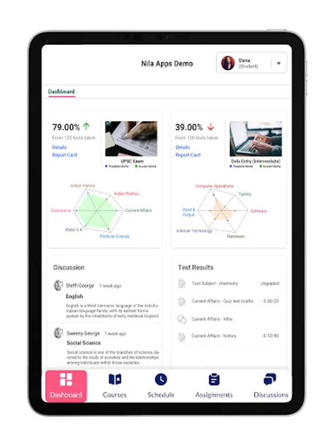Students can participate in their classes by viewing course materials, completing assignments, checking the class schedule and taking tests. The dashboard shows the information regarding the students score, upcoming lessons and assignments that are due. The schedule page lets you view the class schedule, one on one classes assigned by the instructor. Notification messages provide gentle reminders when tests are due and classes begin so you don't miss an assignment or test. The discussion board allows students to interact with the instructor and fellow students in a safe and secure manner. Take the test and know the results right away or at a set time based on how they are set up.