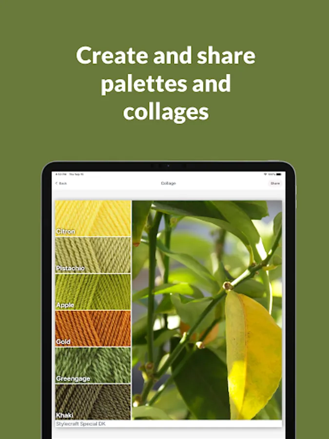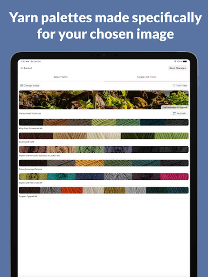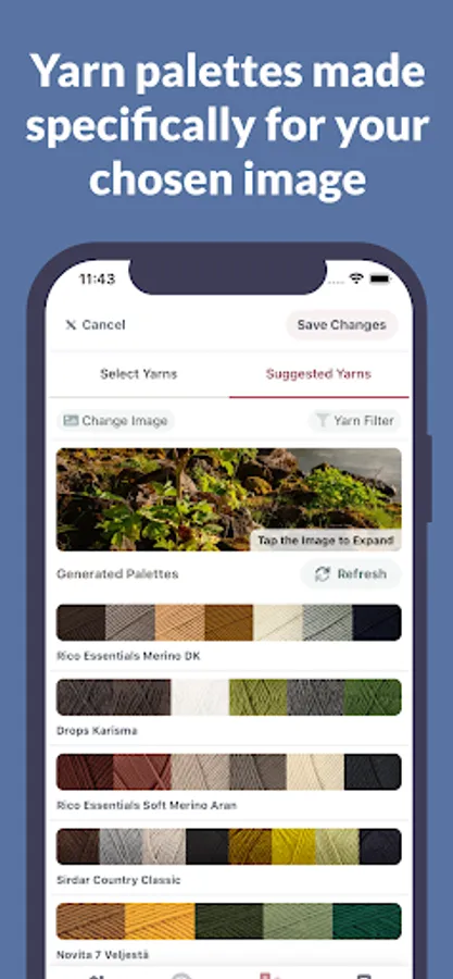 Easily find the perfect yarn colours for your project with our yarn AI feature. Simply upload an image, and the app will suggest palettes that match. You can even save your favourite palettes to your library for future use. Create custom yarn palettes with thousands of virtual yarn options and see how different colours work together before buying yarn for your next project.