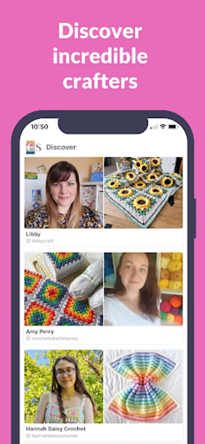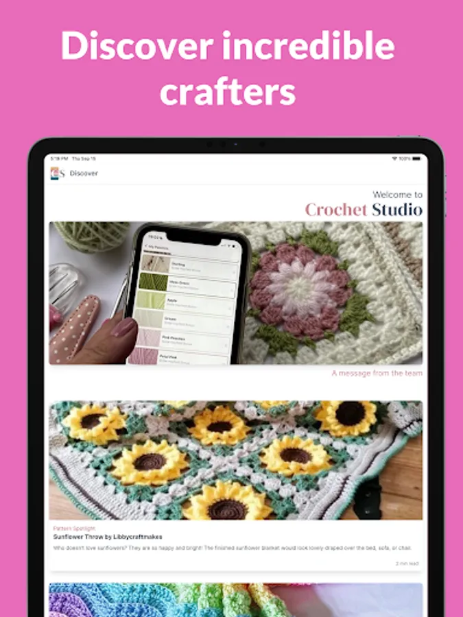Explore a curated collection of crochet patterns, colour palettes, and interviews with crochet experts from around the world. The Discover screen will always highlight the best crochet allowing you to see some incredible crafters that you may have never seen before. Regular updates mean you'll always have something new to see or read about.