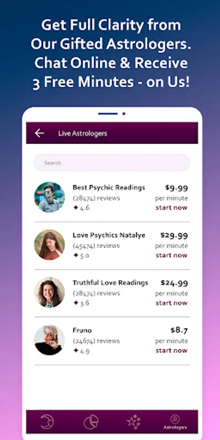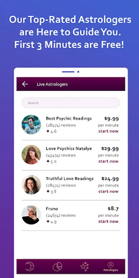 Start chatting with our gifted astrology readers. Get a Free astrology Reading for the first 3 minutes.Open your mind to new possibilities and let your dreams come true. Download the app for free now!