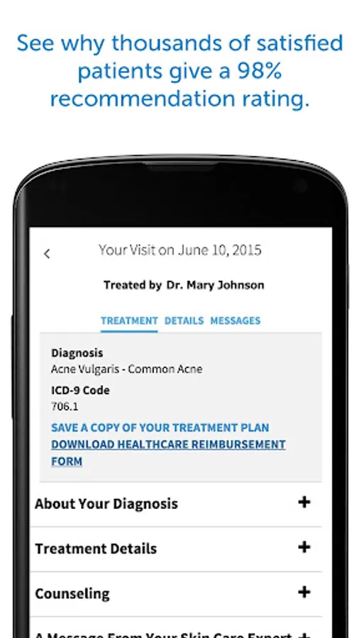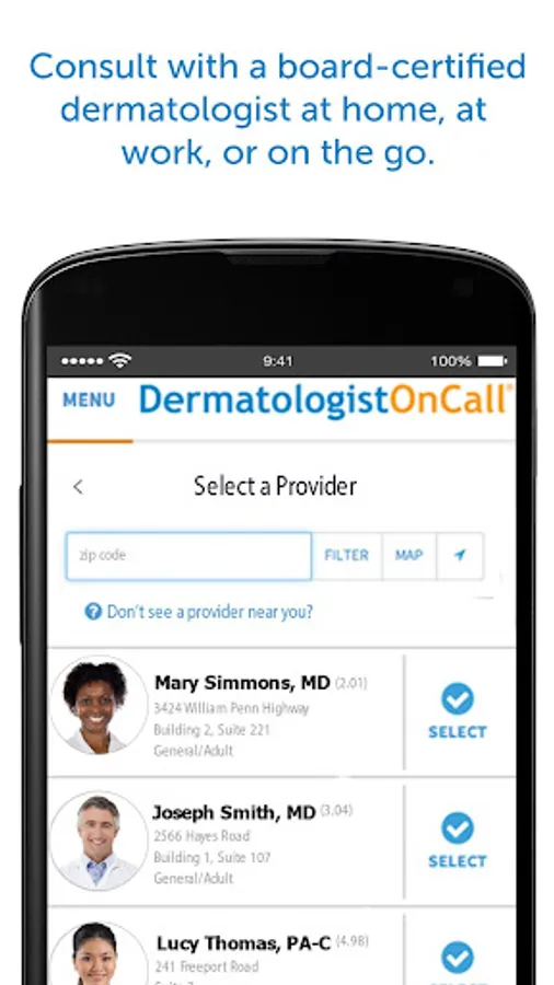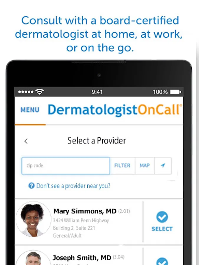 Quickly receive a diagnosis and personalized treatment plan (with prescriptions if medically necessary) from the staff at Dermatology Specialists. Simply upload pictures of your condition and a detailed history through the secure app. More than 3,000 skin, hair and nail issues can be diagnosed online including acne, suspicious moles, rosacea, eczema, psoriasis and many more.