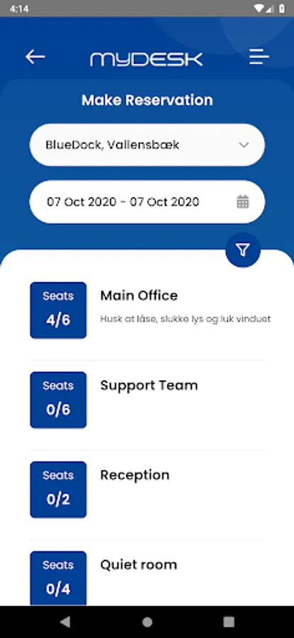 MyDesk is a user-friendly solution that makes it possible for employees to book desks, lunch, parking spots and nd coworkers. It ensures you a organized working enviroment with happy and ecient employees and modern use of the space in the company and other resources.