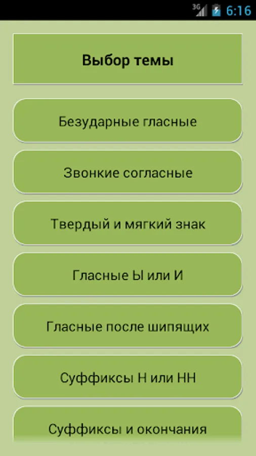 The application is a game in the form of questions and answers on various sections of the Russian language. In interactive mode, answering the questions, you can check out their literacy without expending much effort. After passing the test, you receive a grade for their knowledge in a range of 1 to 5 +. Having passed all the tests, you will know your opinion on every topic and in general in the Russian language.