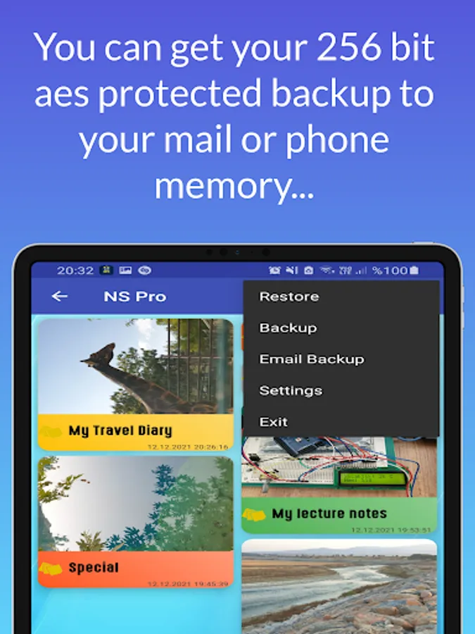Notes Safe Pro app is used to keep your password or important note or encrypted notes. You can use this app as safe notes, safe notepad or locked notepad. This app provide 256-bit AES encryption of database files and backup-restore process. When you open this app you must first enter your password and security question-answer.