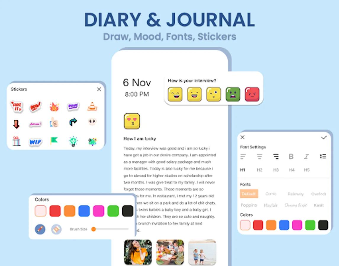 Daily diary journal with lock π enables you to write/record your daily thoughts, journey, private moments, ideas, stories and many more. Journal with Lock β Daily Journal mood diary is an excellent place to express your feelings. daily diary - Daily Journal Mood diary is your best friend who listens to you sincerely without judging and helps you to relive your experiences. π