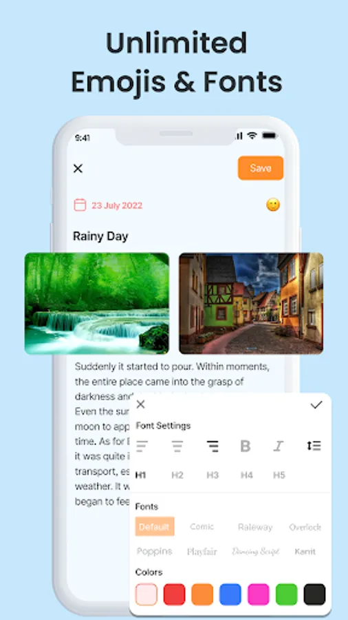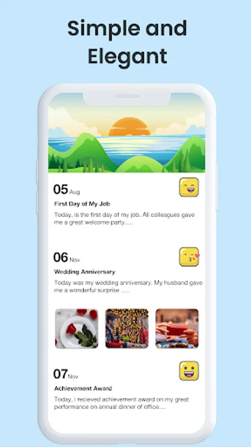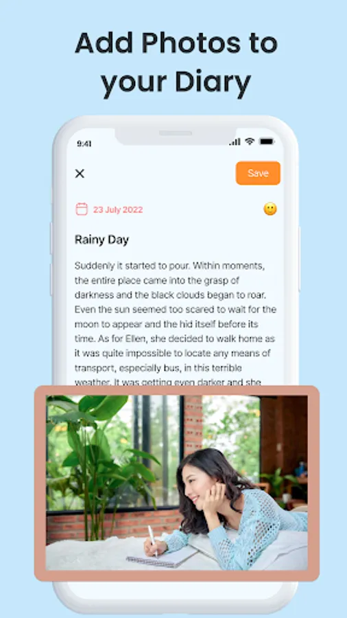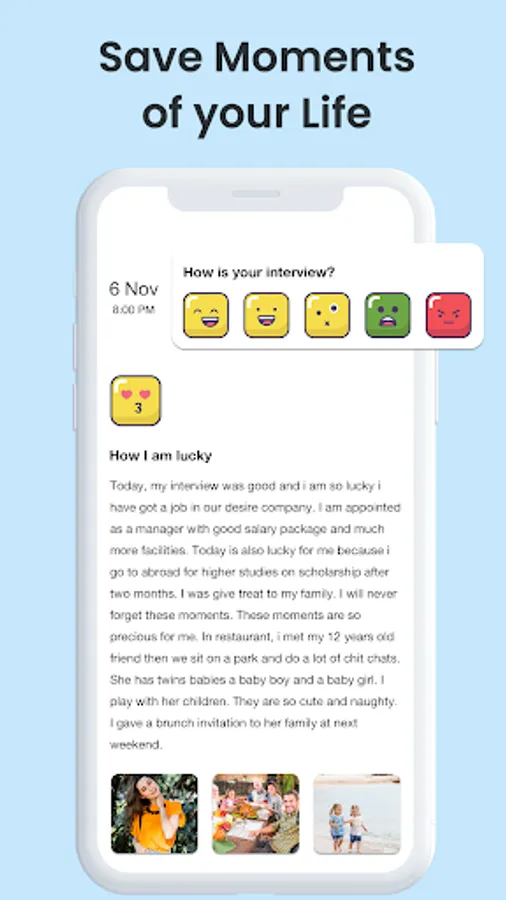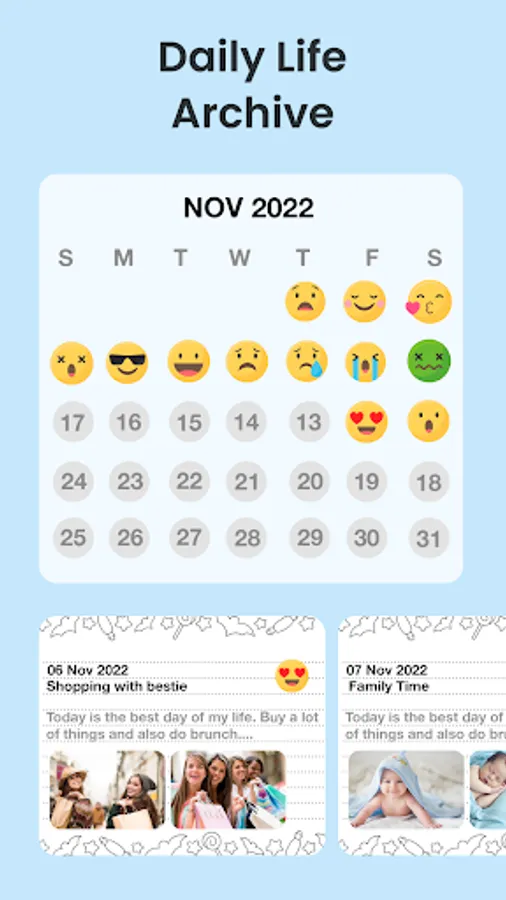 In mood Dairy, you can express our feelings in words. Use emojis to express your mood in the journal.