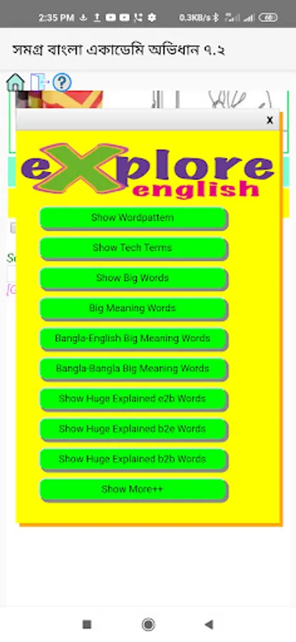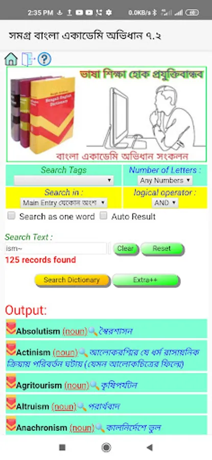 "UltraAcademia" is the only dictionary app in the world allowing fulltext search from all the 3 Bangla Academy dictionaries with one click simultaneously. Be it English or Bangla word, the app can auto-detect the language and you can search by the same search box. The app has a powerful Search-Tags feature presenting a very detailed list of pre-built search terms. It also allows you to use multi-text search facility with AND/OR operator making your search operation as flexible as you want. You can also specify word letters number to narrow down your search result as per requirement. One more magical feature of this app is "Search Dictionary within Dictionary" which means you can tap and hold on any word on the go and get it searched out via popup window. This app also has some powerful add-ons :