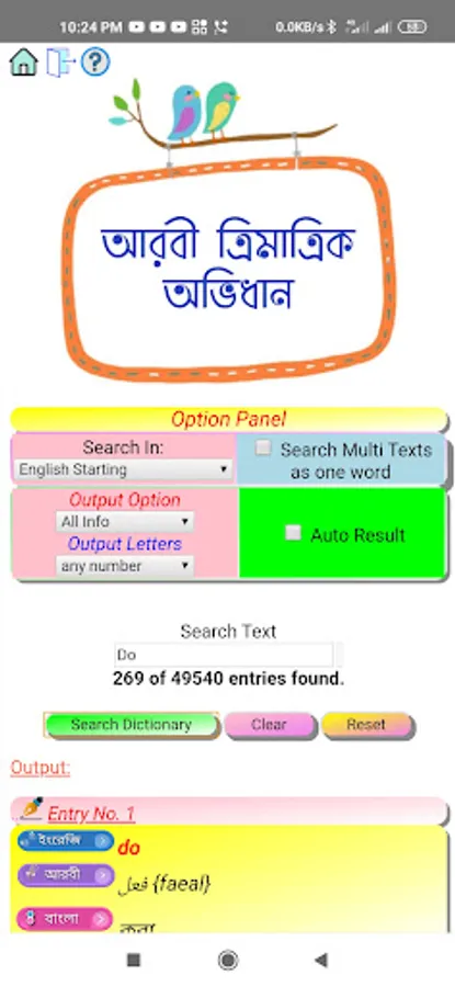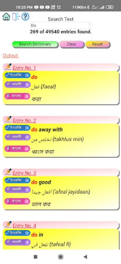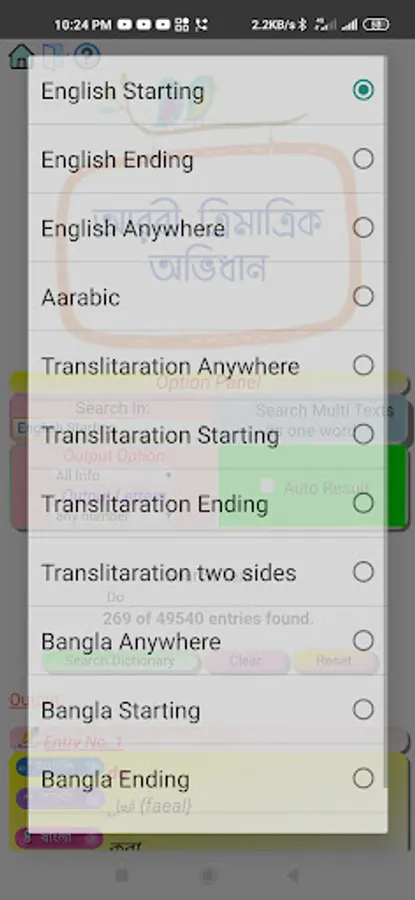 With this app you can search in all the three languages using wildcards features. That means you can search in any of these three languages from both word-begining and word-ending sides. This app presents the 'Transliteration' feature which lets you search arabic word through english characters. For example if you want to find all arabic words rhyming with ٱلْعَالَمِين , you just write 'meen' activating the "Translitaration Word Ending" search option. There are 12 "search options" and 5 "output options" available in this app allowing the maximum number of ways to configure what you want and how you want it. Additionally, with this app, you can list out all the english word ending with "-ment" or "শীল" with just in one click.