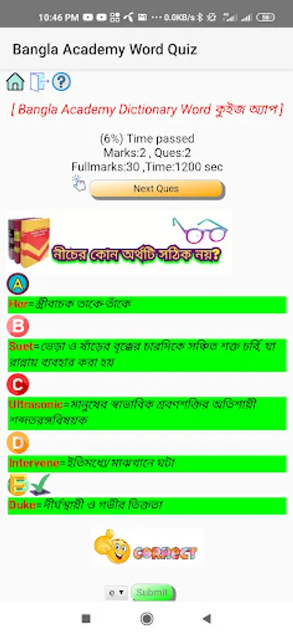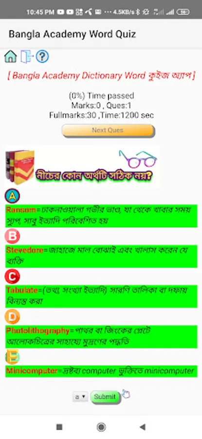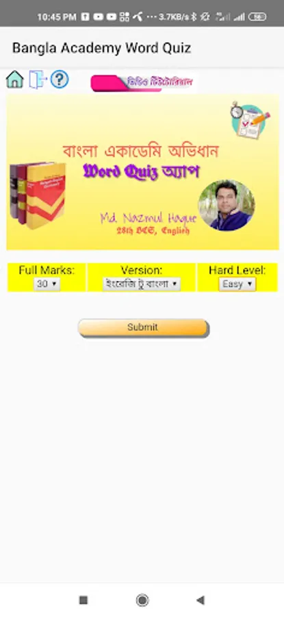 "Bangla Academy Quiz" app can automatically select words and their meanings from the long 3 Bangla Academy Dictionaries and thus can create unlimited numbers of quiz tests for you. You can choose in between 30/50 questions and also select difficulty levels from 'easy' to 'hard'. For each questions, 5 options will be given.The App will automatically count the correct/wrong answers and count your marks and show in real time. Overall, this app gives you a very attractive outlook which you will surely enjoy while giving the tests.