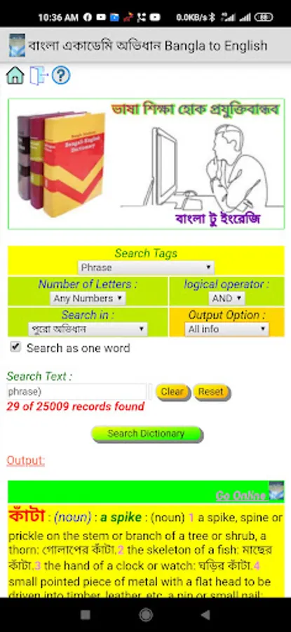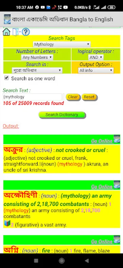 For the first time in Bangladesh, this app digitally offers the 900+ pages "Bangla Academy Bangla to English Dictionary" only in 5MB with super powerful search features. It offers words search both from starting and ending side. It also offers full text search and speak-to-search facility. It is so powerful that you can search out any bangla proverb or idioms right from deep inside the full text data of the dictionary.