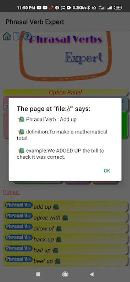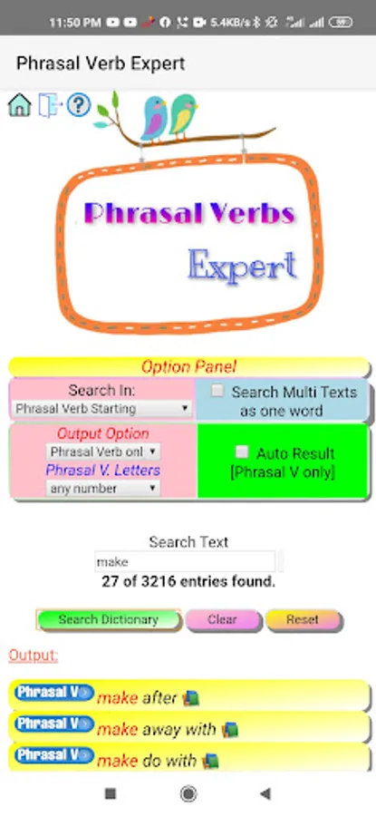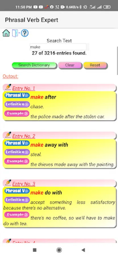 Each entry in this app has three parts - the Phrasal verb, its definition and example. You can search any phrasal verb both from the beginning or ending part. You can also search the definitions or examples. Additionally, fulltext search is available in this app. Say, you want to find all phrasal verbs ending with "into" or "on" , you can easily search them by single click.