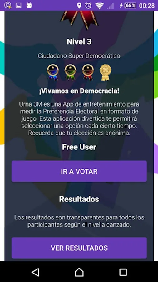 Urna 3M is an App for entertainment with real rules, we intend a measurement of electoral preference in game format. This application will allow you to vote or select an option, but every so often (once per level). At the same time you earn a player badge. The results are transparent to all participants according to the level achieved.