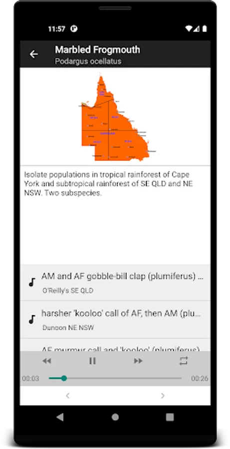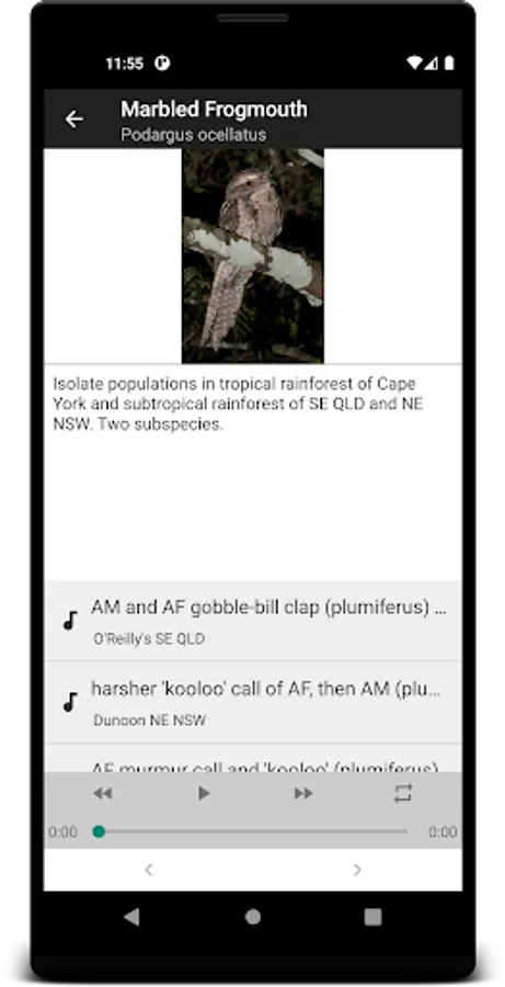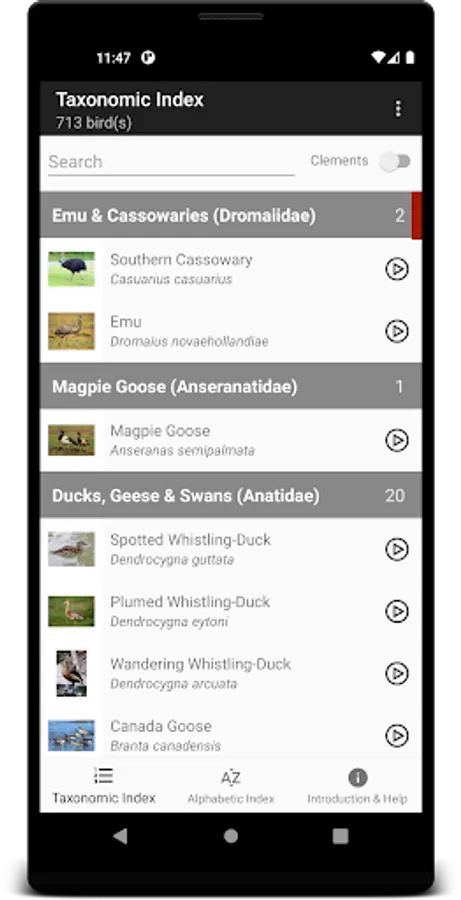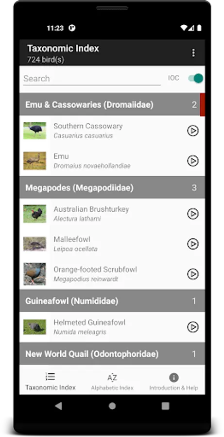 The app contains a taxonomic and alphabetic listing of birds with the ability to switch between IOC 10.1 and Clements World taxonomies with a tap of a button.