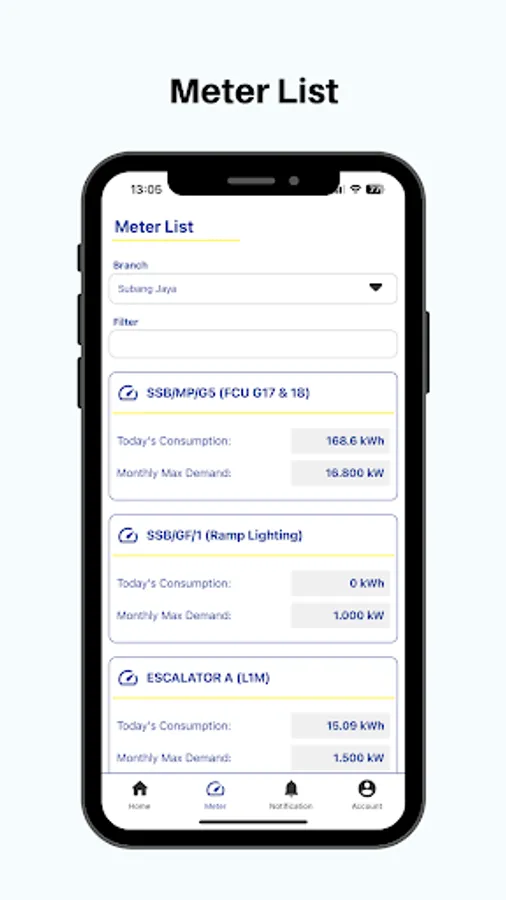 Mydin EMS is the energy monitoring application for staffs of Mydin. This application will have functionality to view their branch usage in overview, meter usage by branch in overview and graphical in interval, daily and monthly. Other functionality is notification if threshold exceed limit and profile view.