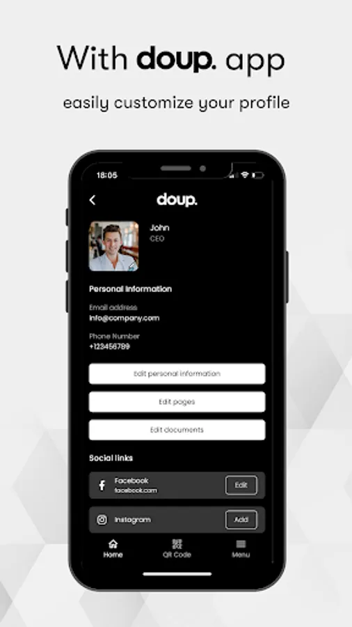 The Doup app will allow you to edit the contents of your virtual business card easily and very fast. Also, you will be able to add your profile's QR code to your phone wallet, so in case you leave your physical Doup card at home, you still will be able to share your contacts with your Doup app or phone.