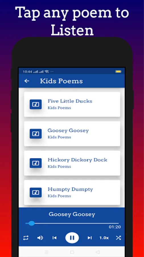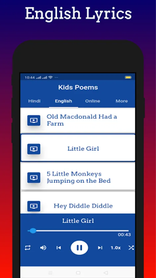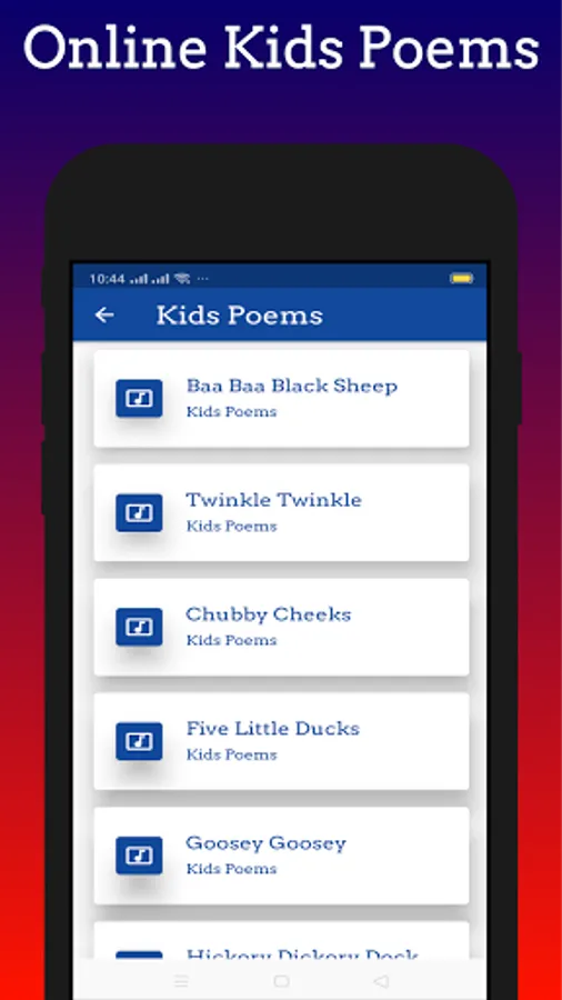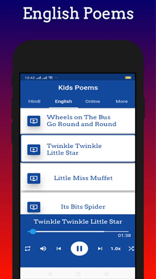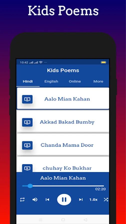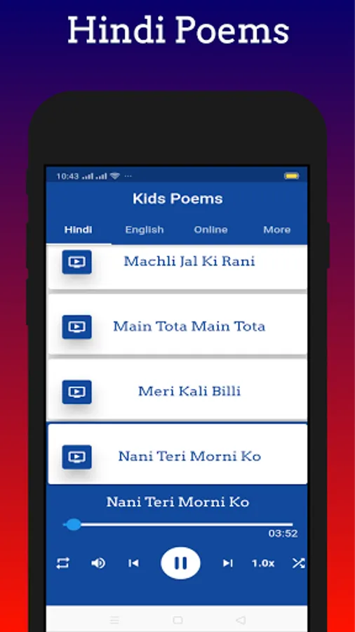 This app contains favourite songs for kids with Urdu, Hindi and English. You can listen Hindi poems as offline or online. Just tap on any song and start listening nursery poems in English or Hindi language.