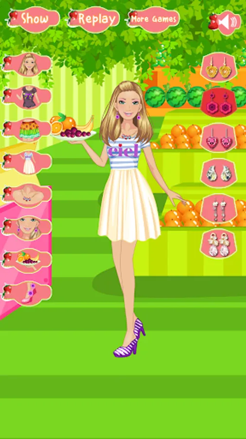 Have you met our cute fruiterer girl! She likes fruits and sell all kind of fruits. She goes her greengrocer everyday. As she is a cute girl she must dress cool and attractive clothes everyday. Today your task is to dress her up with cool clothes. After you choose appropriate clothes for her she will go to her greengrocery with those outfits.