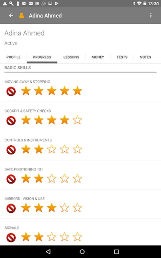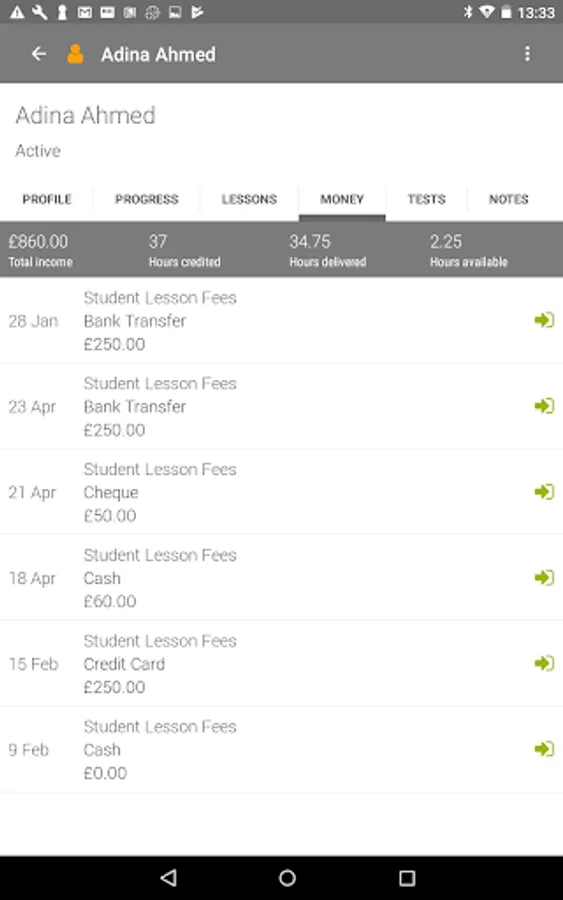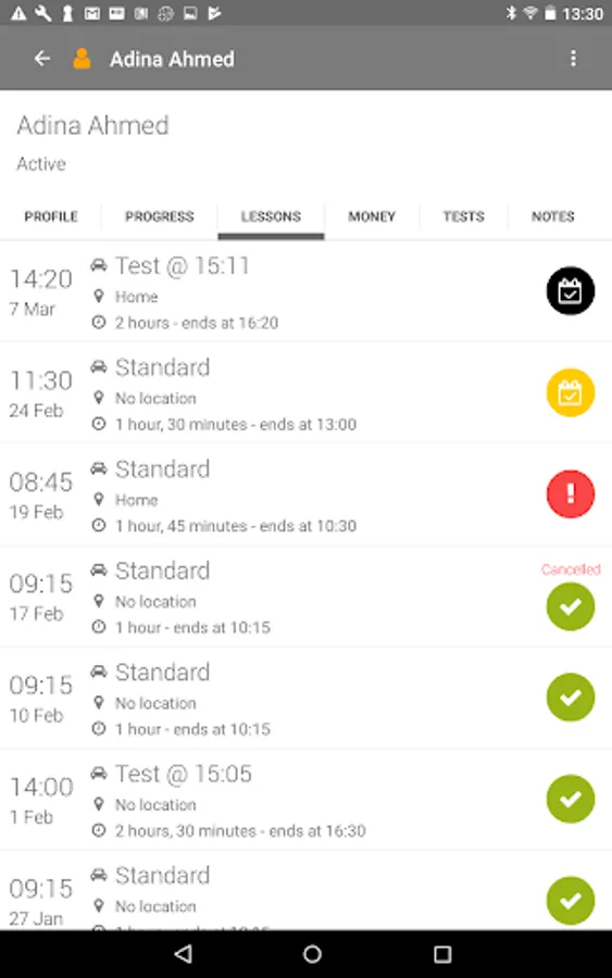 The MyDriveTime STUDENTS module stores everything you need to know about your students. Instantly access their profile, learning progress, test attempts and lesson history. Effortlessly track money paid, lessons delivered and any pre-paid time remaining. Integration with Diary and Money ensures your full student record is always at your fingertips.
