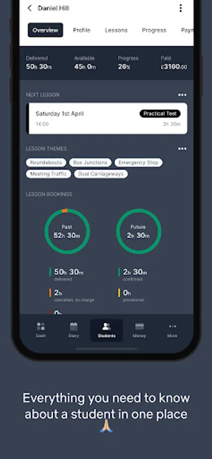 The MyDriveTime STUDENTS module stores everything you need to know about your students. Instantly access their profile, learning progress, test attempts and lesson history. Effortlessly track money paid, lessons delivered and any pre-paid time remaining. Integration with Diary and Money ensures your full student record is always at your fingertips.