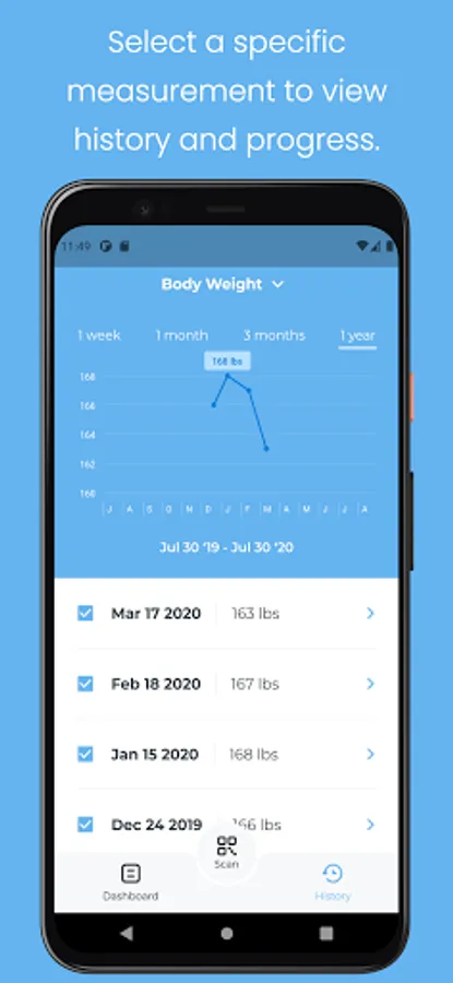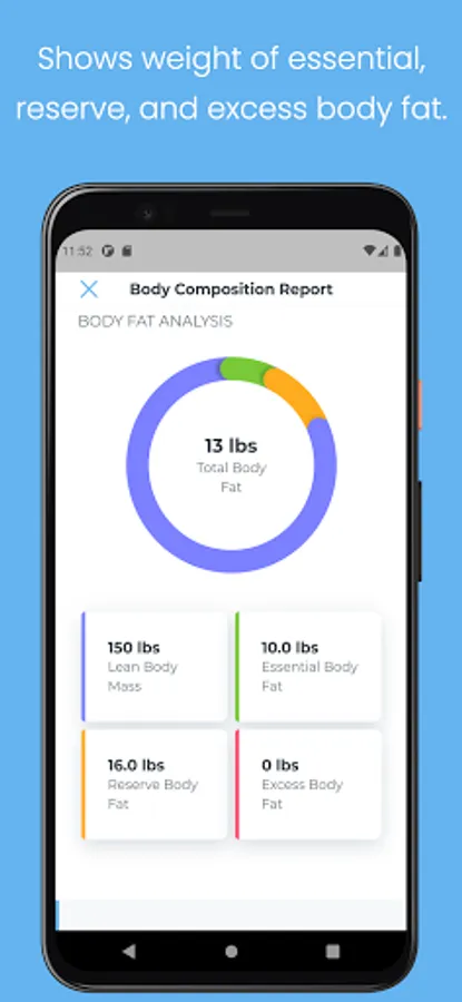 Review your personal dashboard with a quick view of body weight, vitals and individual measurements. Body fat analysis shows the weight of your three body fat types: essential, reserve, and excess body fat. History and individual progress are available for each measurement.