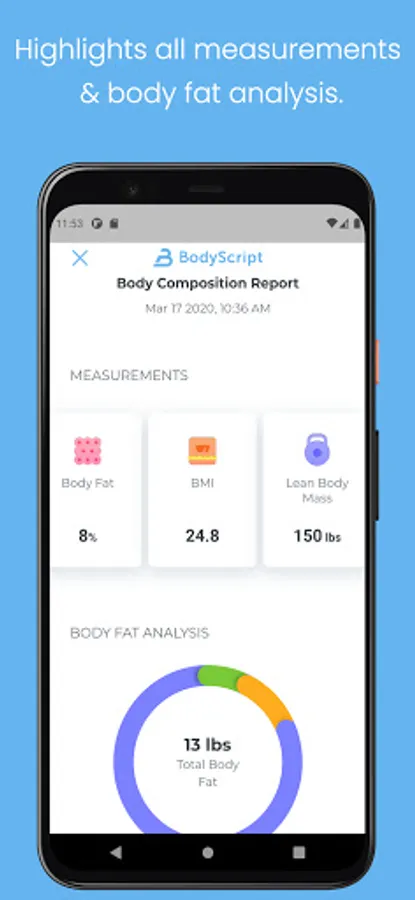 Advanced BodyScript patented technology provides gold-standard accuracy of muscle, fat, bone mass, and water body measurements in seconds. All body measurements from a BodyScript analyzer are encoded inside the Digital QR code. Test results can be instantly scanned by the BodyScript mobile app. No Bluetooth connection required.