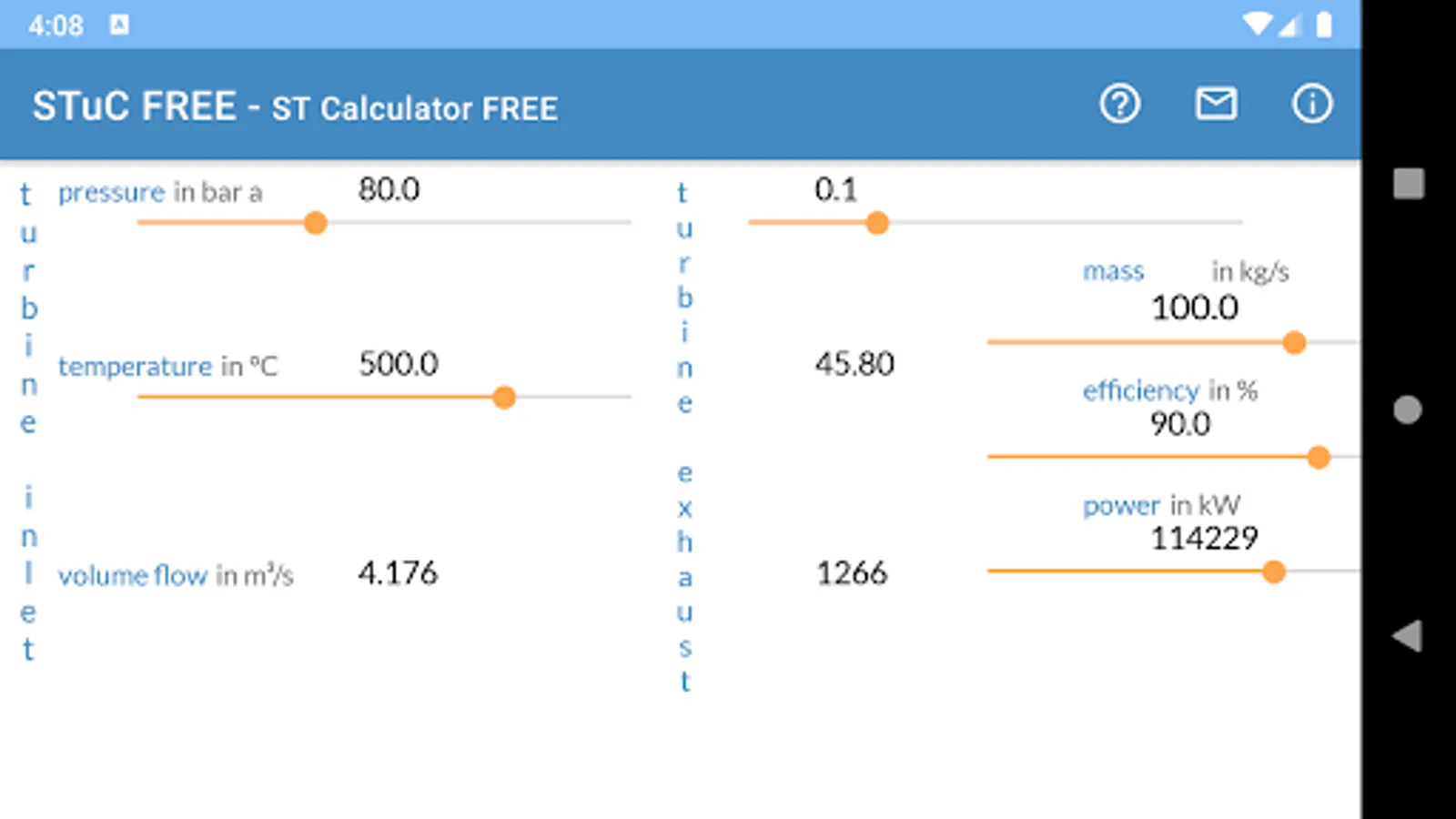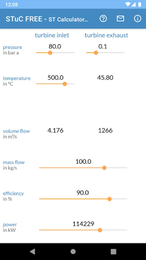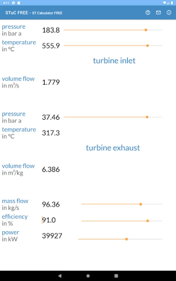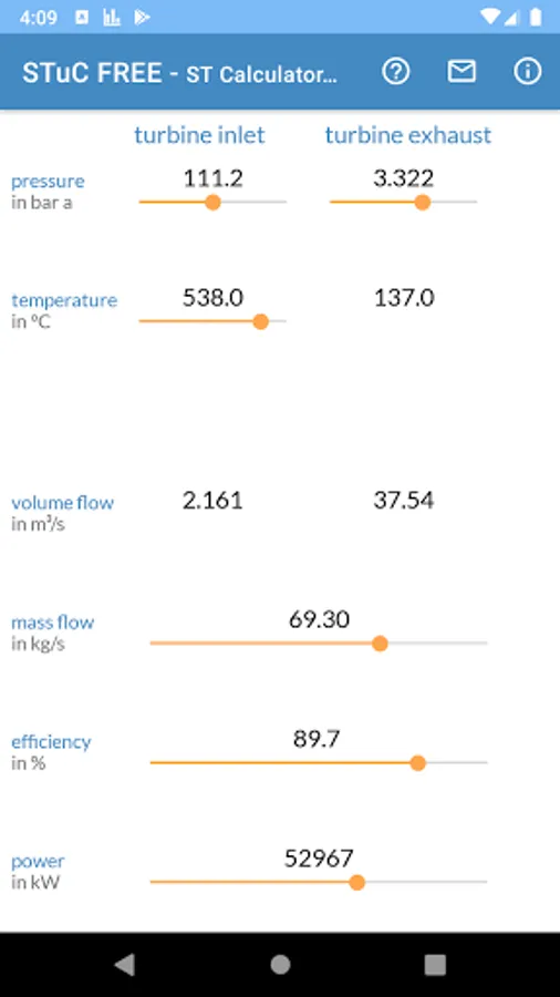 You can easily edit the boundary conditions by the app sliders. For each calculation inlet pressure, inlet temperature and exhaust pressure are mandatory. Turbine power, volumetric flows and exhaust temperature can be calculated.
