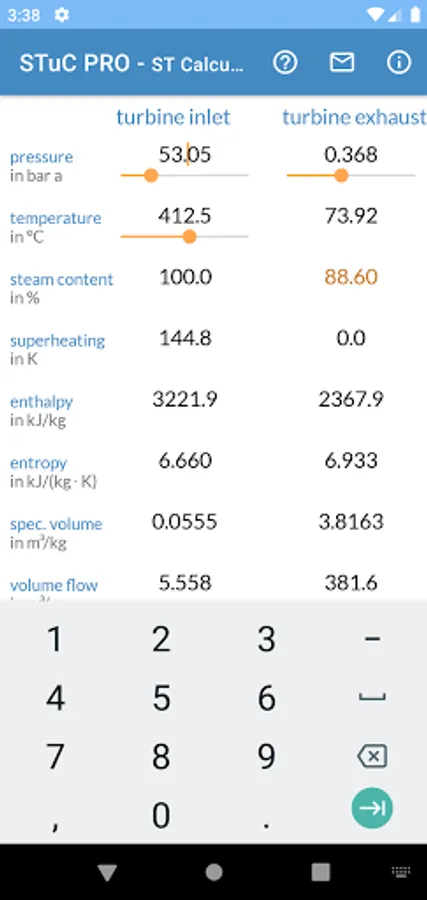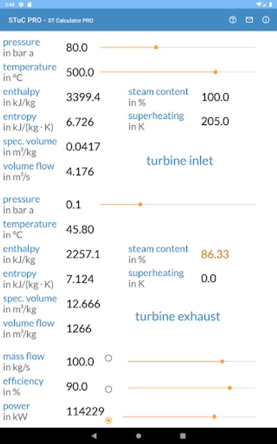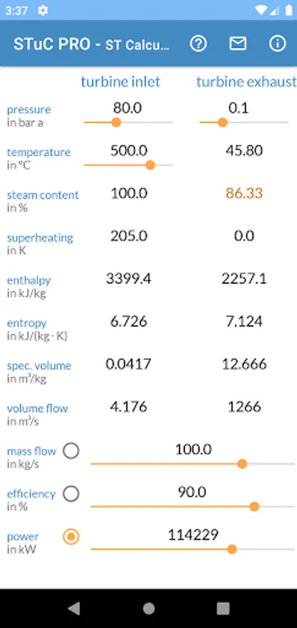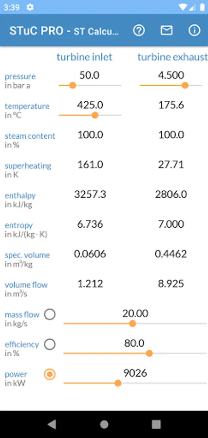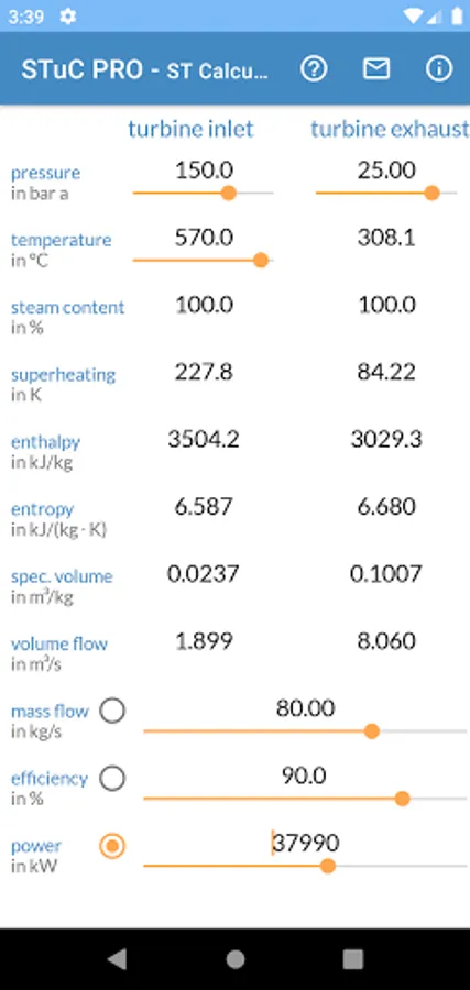 You can easily edit the boundary conditions by the app sliders or direct as value input. For each calculation inlet pressure, inlet temperature and exhaust pressure are mandatory. One of the three parameters mass flow, efficiency or power can be calculated. You can switch between these three parameters.