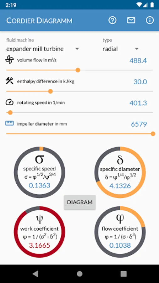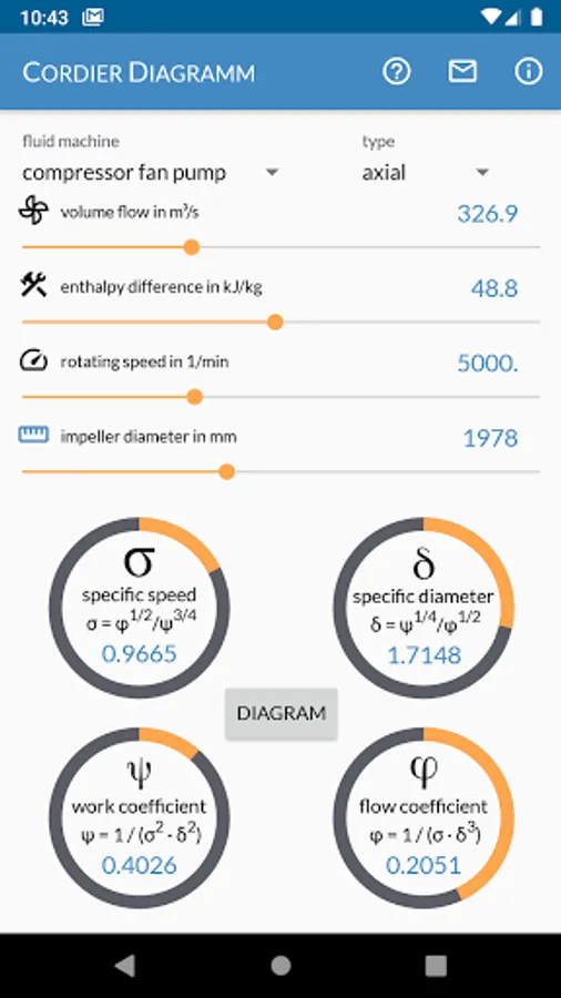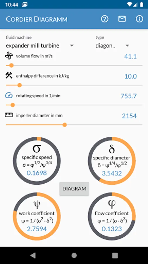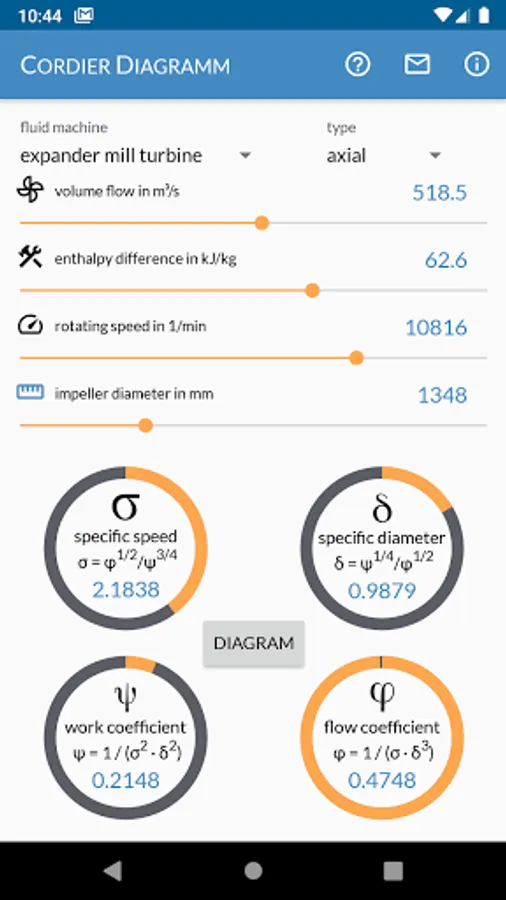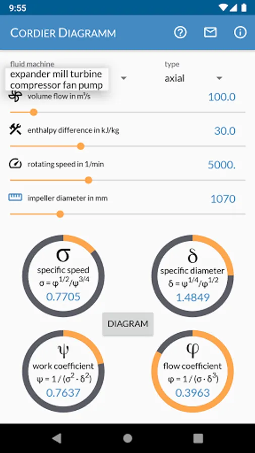 Cordier Diagram is the Swiss Army knife for your first shot in turbomachinery design. With this app you can determine the type (axial, diagonal, radial) of your compressor, pump, fan, turbine or mill. Calculate the diameter based on volume flow, specific enthalpy and speed or use the backwards calculation to calculate volume flow or speed at a given geometry.