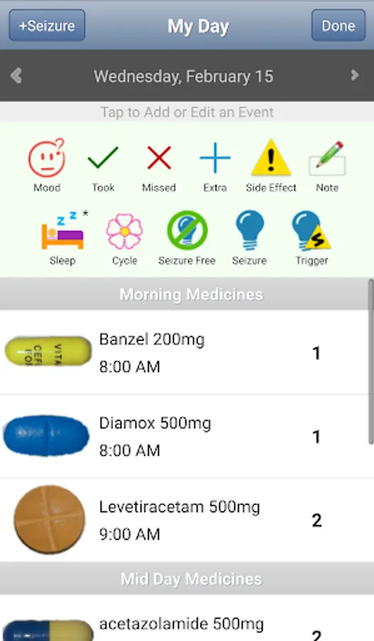 EpiDiary has Visual Medication Management (VMM) technology to improve your safety in taking medications. In a world where medications from different sources are provided to patients, the color, size and shape of the pills changes frequently. Having large, actual photos of your own medications on your phone provides new and better capabilities that can help you.
