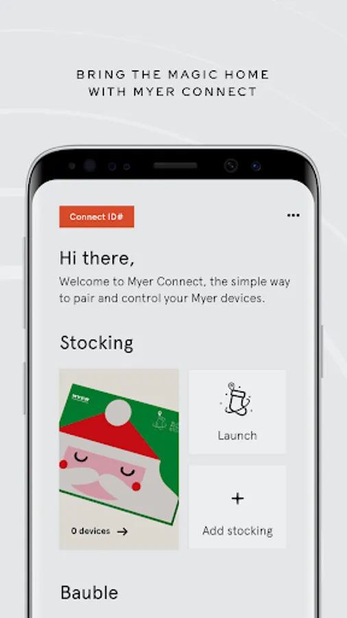 Myer Connect allows you to pair your smartphone with both the Global Positioning Stocking and the Naughty or Nice Bauble, keeping access to your Myer Connected products at your fingertips.
