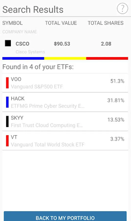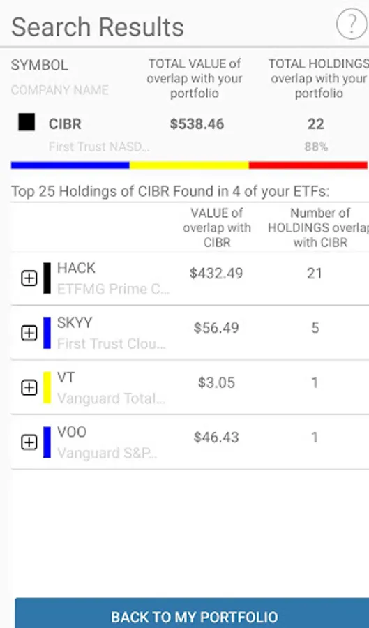 1. Compares stocks across multiple ETFs (ETF holdings) and finds an overlap value in seconds. If you want to know to what extent specific ETF or stock overlaps with your portfolio then this app is for you.