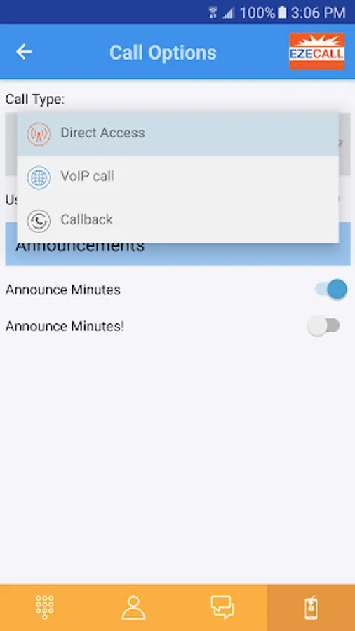 You own cellular number is your account with EzeCall Dialer; you get a passcode in SMS message or a phone call to authenticate you. Default calling method is Local Access, when you dial a phone number or choose one from your contacts; dialer attaches this number to a local number on our servers and dials that number. (Your Wifi/Data internet connection will be used for this local number setup). This local number automatically connects the call to the long distance number you originally dialed. If you have chosen “Callback” as calling method; when you dial a number or choose one from your contacts, dialer will send this number to our servers and our server will send you a call back on your phone number and connect this call to the number you originally dialed. Last but not the least is the “Internet” calling which makes the call using Wifi/Data internet connection without using allocated minutes from your provider. Internet dialing is also the best choice while you are roaming out from your provider’s coverage and have an internet connection available to you.