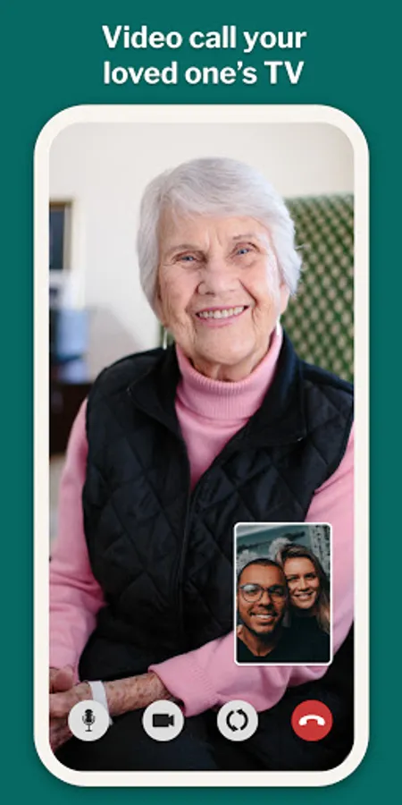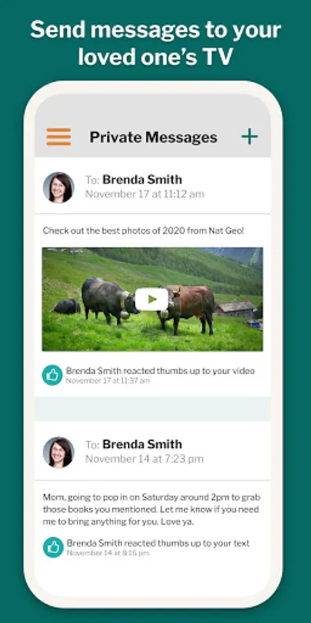 Enables family members easy and persistent access to communicate with their loved one through their loved one’s TV. Types of content include messages, videos, photos and video calls.