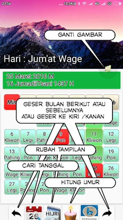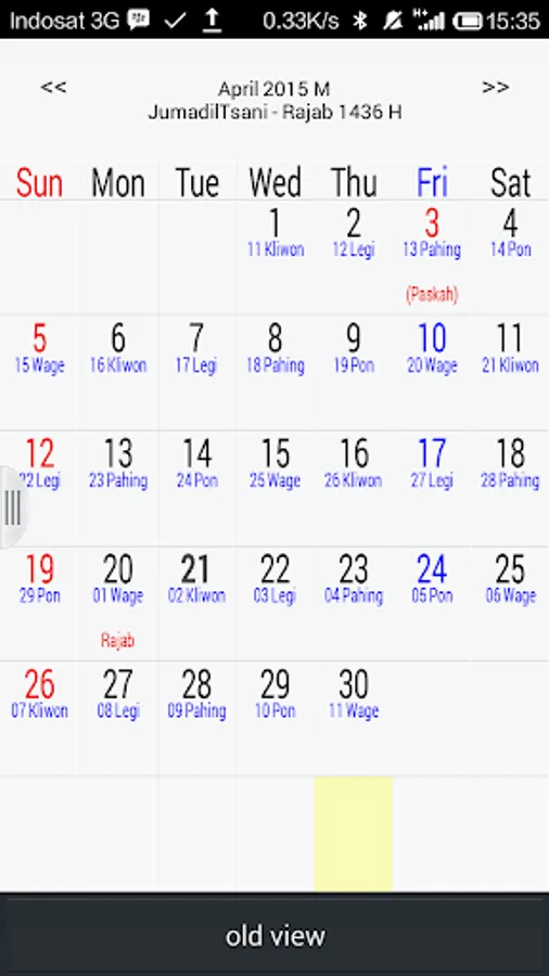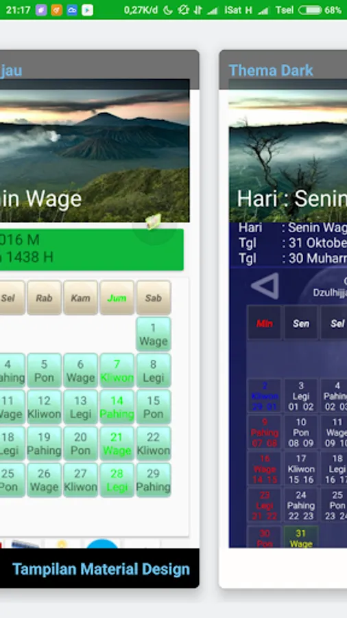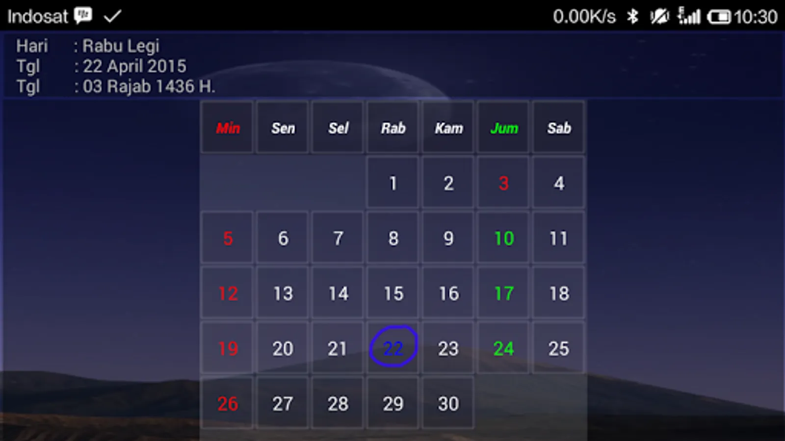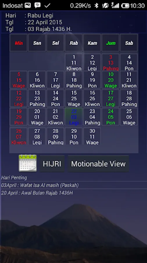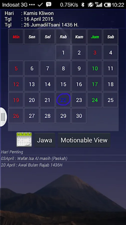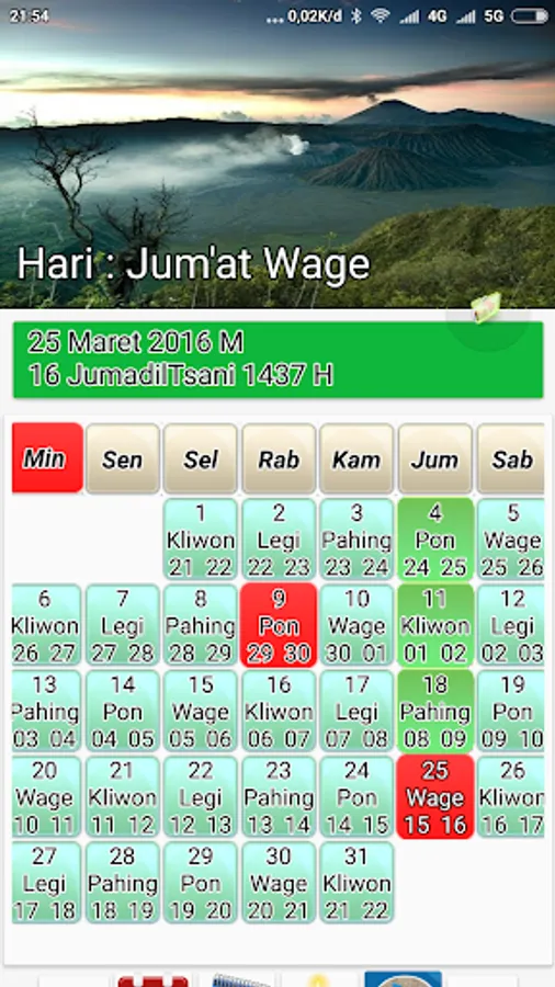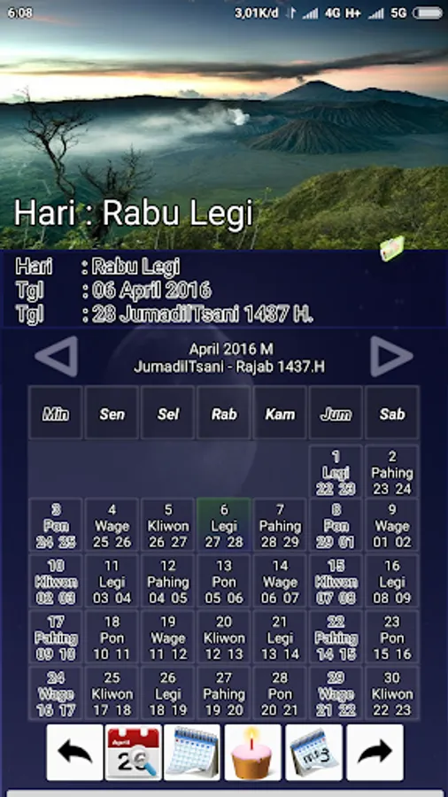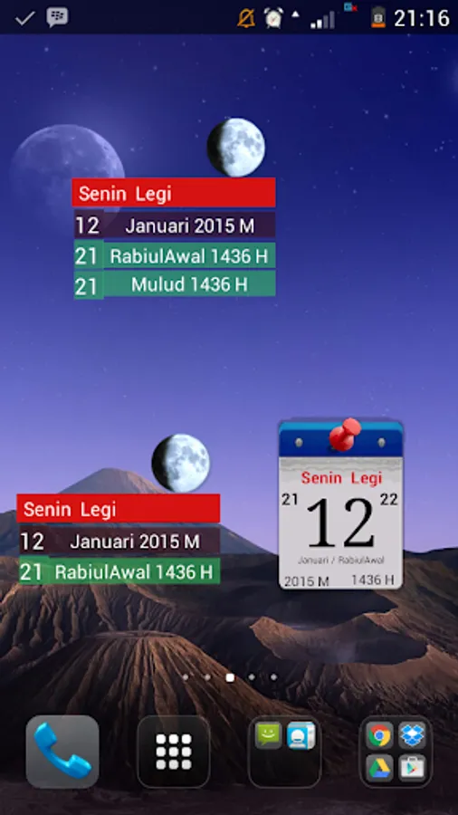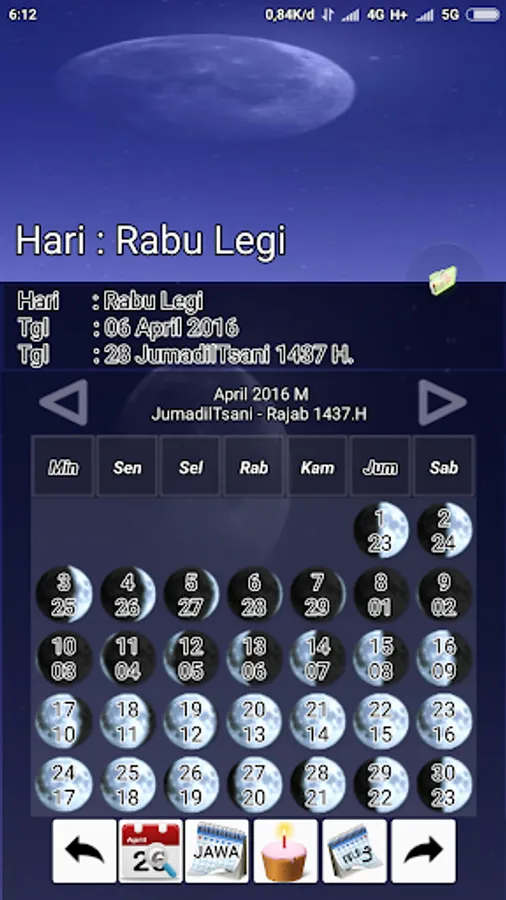 3 calendar modes for Gregorian, Hijri, Javanese and moon phases