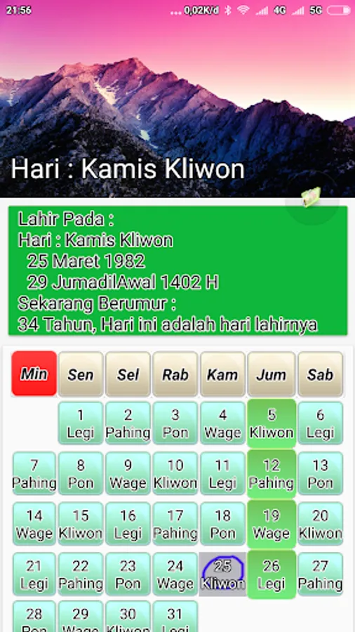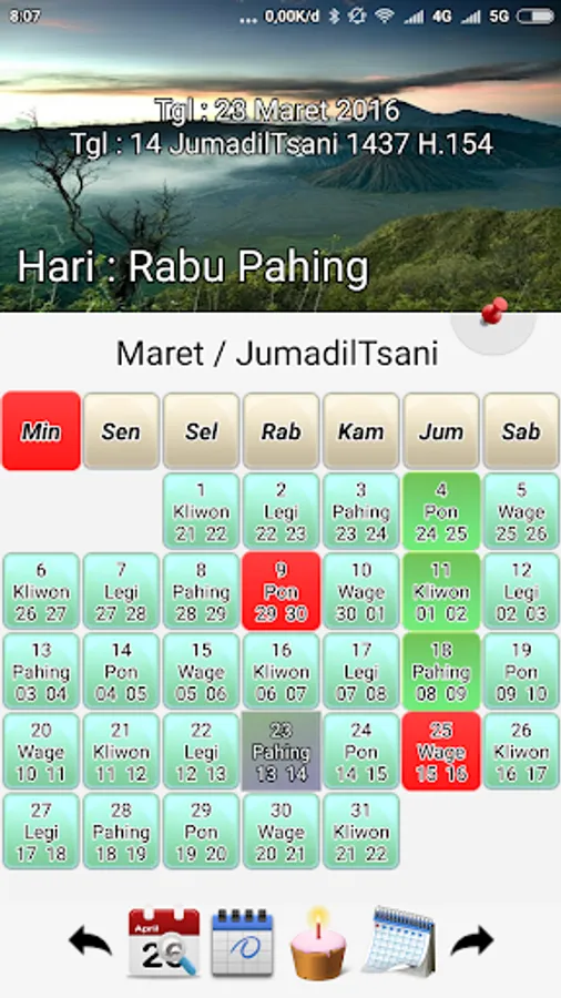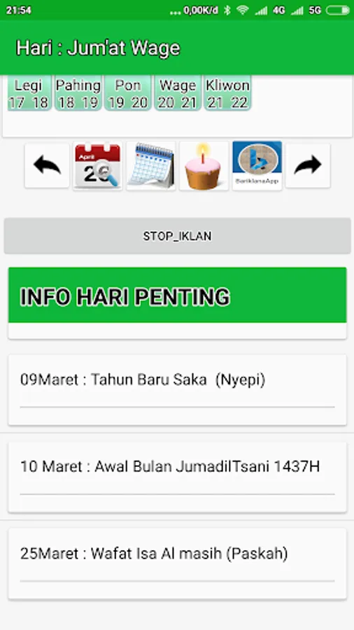 allows knowing the market day of Java, accompanied by the shape of the month according to the date, and also info on important days