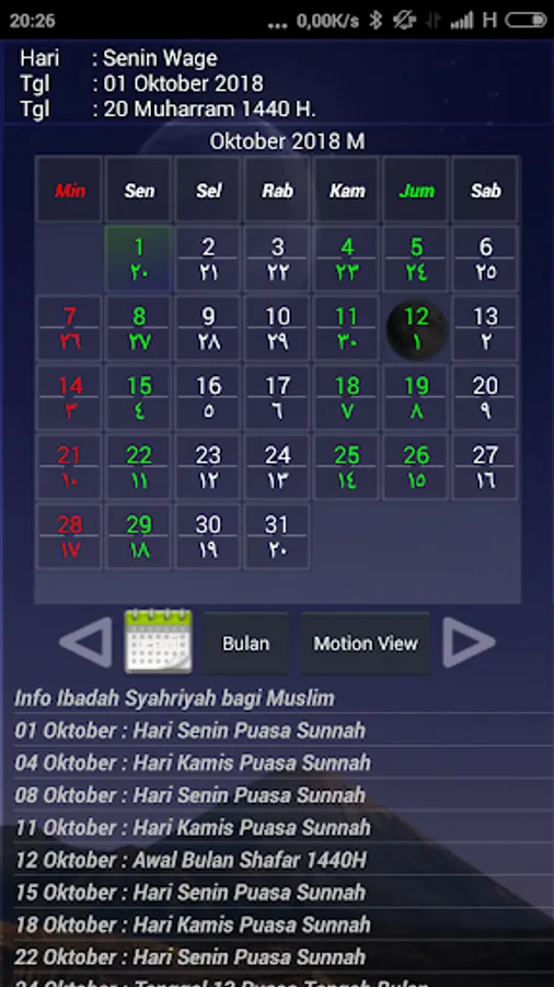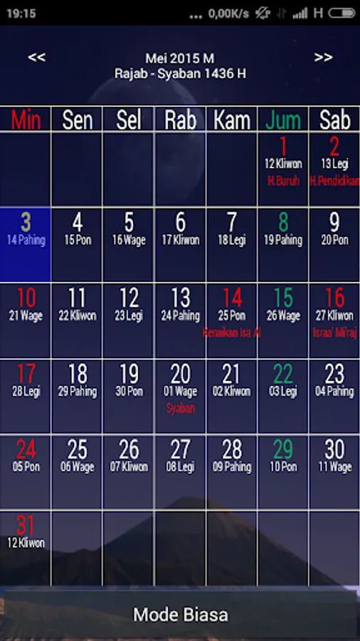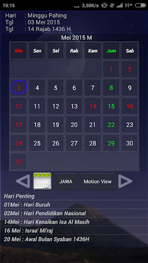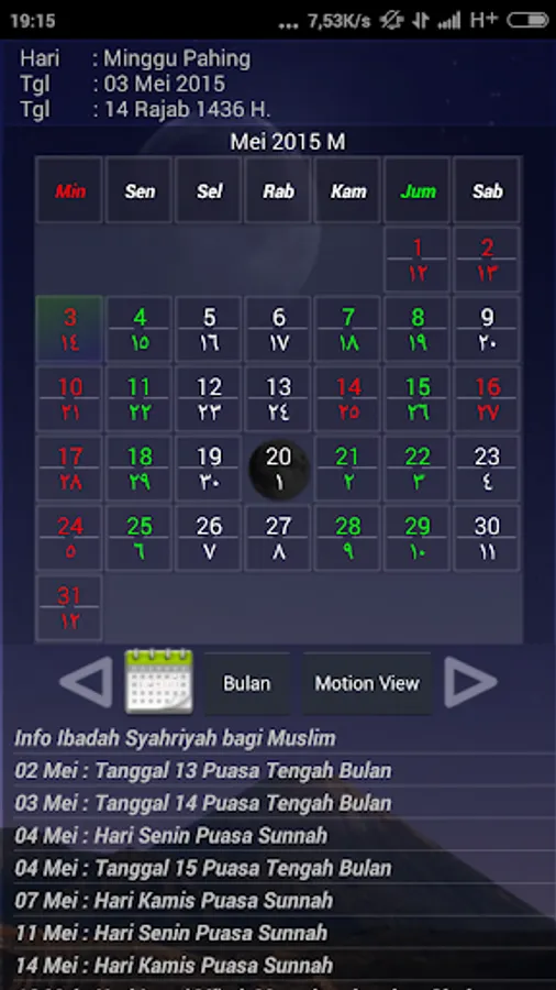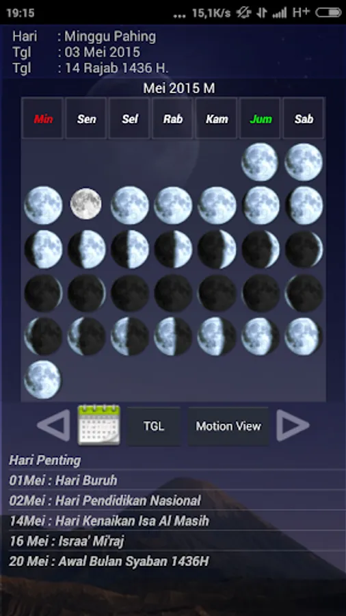 3 modes of the Gregorian calendar, hijri, Java and phases of the moon