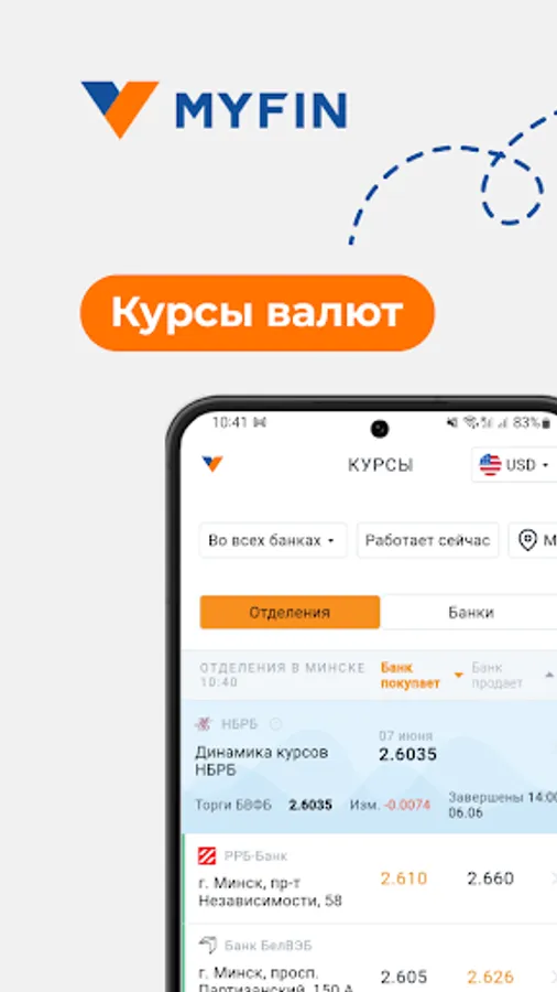Myfin.by - the best exchange rates in Minsk and Belarus. A convenient currency converter at the rate of the National Bank of Belarus and the Central Bank of Russia. Dynamics of changes in rates with charts. Exchange rates on the map. Search for branches and exchange offices of banks in all cities of Belarus.