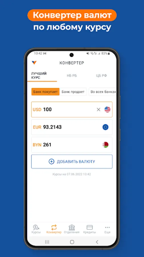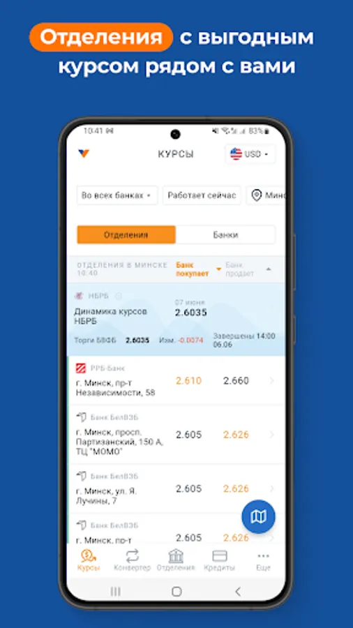 In the application for each branch you will find all services, up-to-date phone numbers, exchange rates, cross rates and a currency converter.